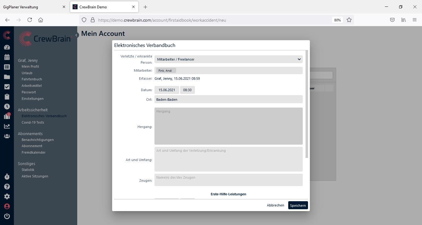 Gehen Sie unter Mein Account > Elektronisches Verbandbuch auf "weiteren Eintrag hinzufügen". Dort können zu jedem Vorfall die gem. DGUV-Vorschrift benötigten Informationen zum Hergang, den Erkrankungen oder Verletzungen sowie den Erste-Hilfe-Maßnahmen erfasst werden. Vorfälle können sowohl für den aktuell angemeldeten Benutzer als auch für dritte Personen erfasst werden.