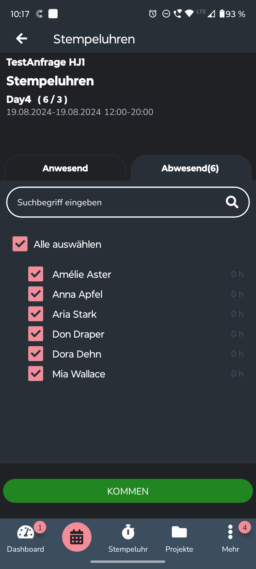 Nun öffnet sich eine Ansicht, in der alle gebuchten Mitarbeiter/Freelancer aufgelistet sind. Über das Auswahlfeld "Alle" können alle Personen angewählt werden. Mit Hilfe der Auswahlfelder vor den Namen können einzelne Personen an- oder abgewählt werden. Somit kann der Projektleiter also steuern, für welche Personen er die folgende Aktion ausführen möchte. Hat er z.B. alle angewählt, wählt er im unteren Bereich "Kommen" aus. Dann wird abgefragt, ob die aktuelle Uhrzeit als Startzeit genutzt werden soll und bei Bedarf, kann die Startzeit direkt angepasst werden. Nun läuft die Arbeitszeit für alle gewählten Mitarbeiter/Freelancer ab der aktuellen (oder ggf. korrigierten) Uhrzeit.