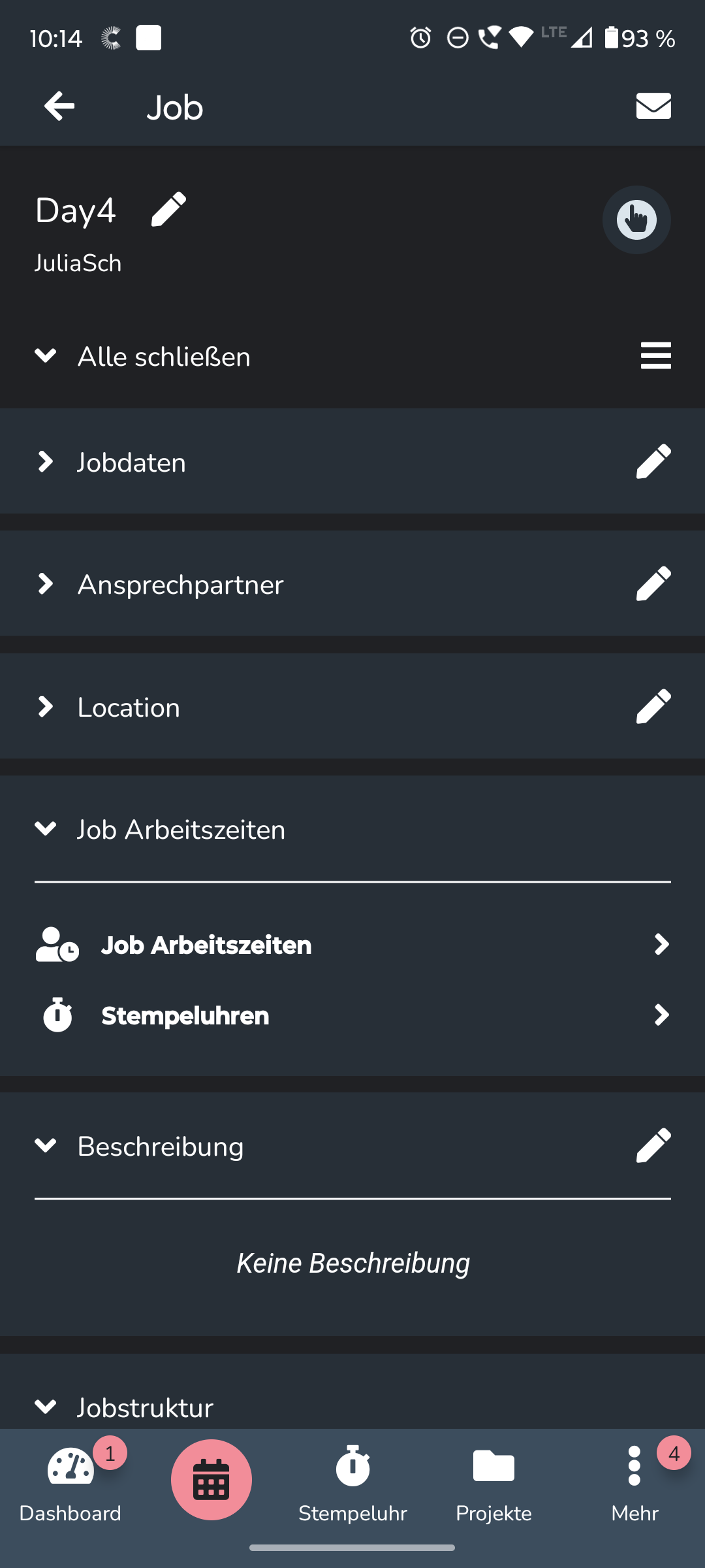 Öffnet der Projektleiter in der Smartphone App den Job, so erscheint ein zusätzliches Feld "Job Arbeitszeiten" mit den zwei Optionen "Alle Arbeitszeiten" und "Stempeluhren".