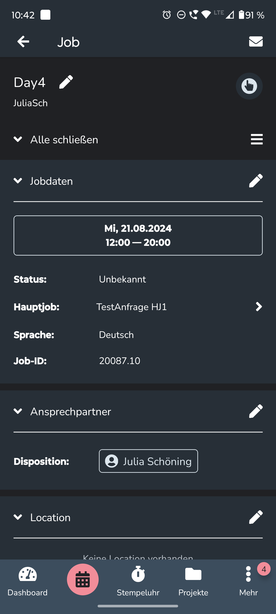 Soll eine Person vor Ort die Teamleitung übernehmen und das Personal gesammelt ein- bzw. aus- oder zur Pause stempeln, dann sollte diese Person in der Job-Planung in die Zeile "Projektleiter" eingetragen werden. Dadurch erhält die dort eingetragene Person zusätzliche Berechtigungen, die ausschließlich für den Job gelten, in dem sie als Projektleiter eingetragen wurde.