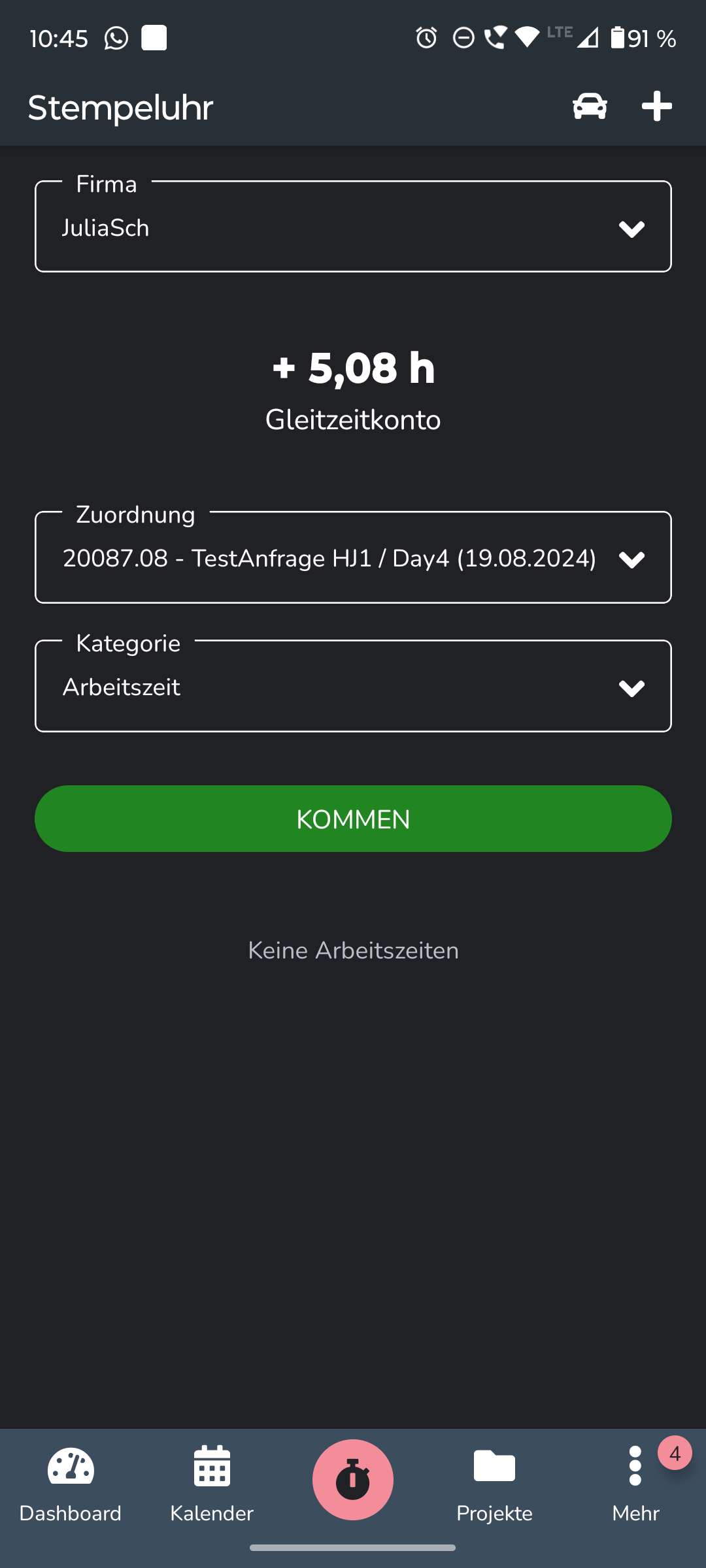 Um Zeiten auf den Job zu stempeln, für den Sie gebucht sind, klicken Sie einfach auf „kommen“, für Pausen auf „Pause“ und zum Ausstempeln auf „gehen“. Möchten Sie auf einen anderen Job, ein anderes Projekt oder auf unabhängige Zeiten stempeln, klicken Sie auf die obere Zeile der Stempeluhr, um dann unten das Entsprechende auszuwählen. In der Desktop-Ansicht können Sie unter Verwaltung > Projekte > Voreinstellungen auswählen, welche Projekt-Typen für wen in der Stempeluhr sichtbar sein sollen.