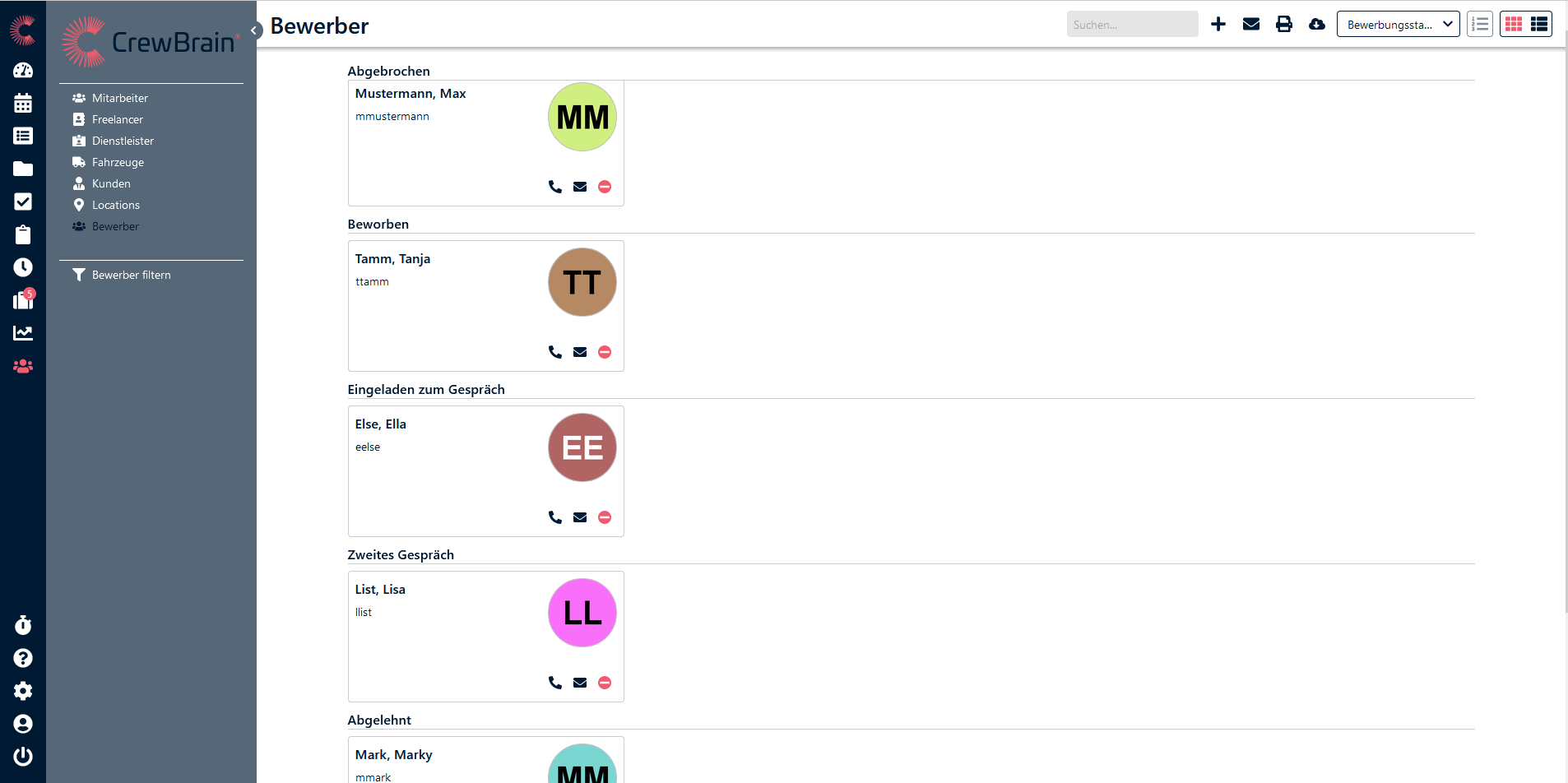 In der eigenen Kategorie „Bewerber“ in den Stammdaten sehen Sie dann auch direkt den Bewerbungsstatus – "abgebrochen" (wenn die Bewerbung nicht abgeschickt wurde), beworben“, „eingeladen zum Gespräch“, „erstes Gespräch“, „zweites Gespräch“ oder „abgelehnt“.