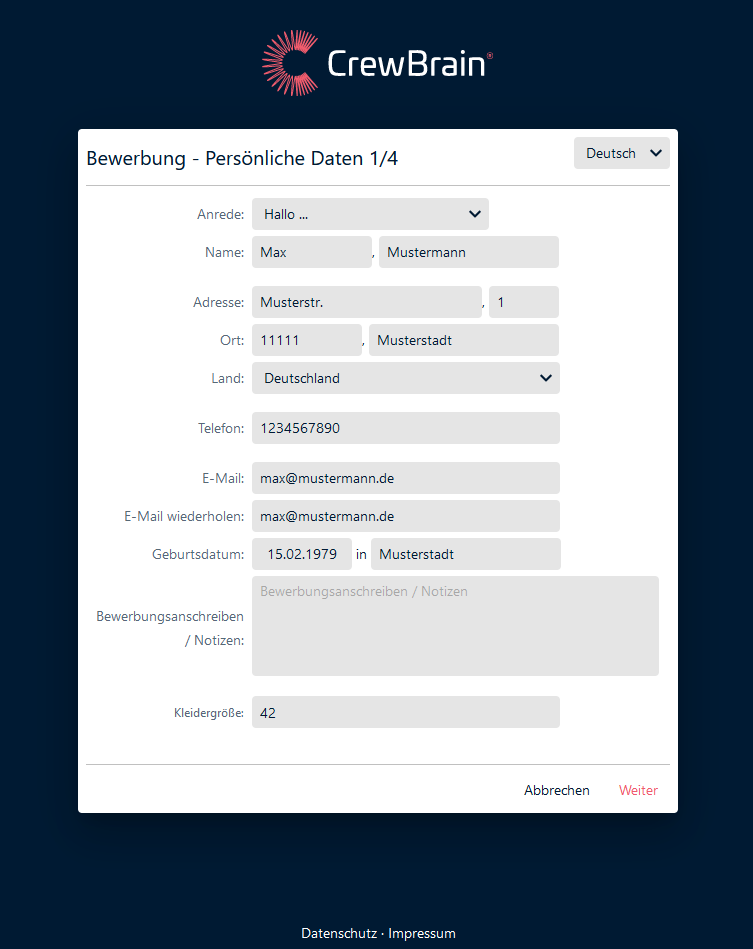 Wenn Sie den Link zu Ihrem persönlichen Bewerberportal (https://eigenedomain.crewbrain.com/application) beispielsweise auf Ihrer Homepage veröffentlichen und Interessierte diesem folgen, müssen Sie im ersten Schritt der Datenverarbeitung zustimmen. Danach erhalten die Bewerber die Liste der offenen Postionen und können hier die gewünschte wählen. Daraufhin werden die persönliche Daten und die von Ihnen in der Verwaltung konfigurierten Daten abgefragt. Haben Sie den Haken bei „Dokumentkategorien anzeigen“ gesetzt, kann der Bewerber beim Hochladen seiner Dokumente in einem Dropdown entscheiden, welcher Kategorie das jeweilige Dokument angehört. Außerdem kann der Bewerber ein Foto hochladen.