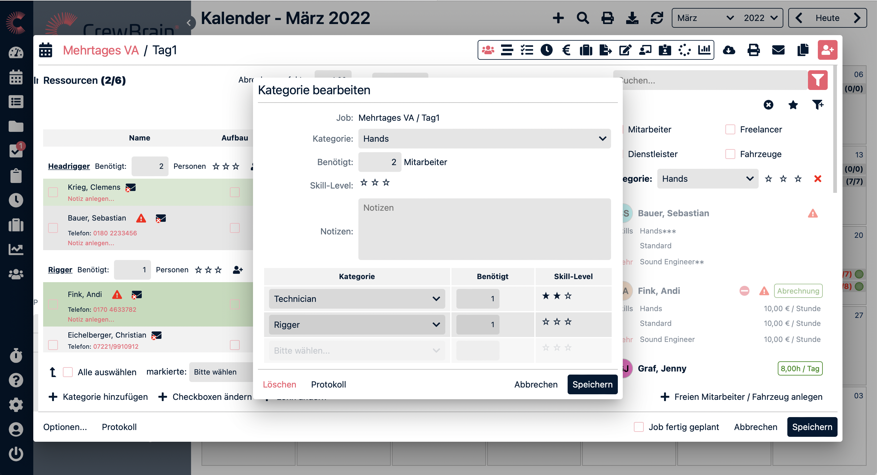 Die Kategorien, auf die Sie die Mitarbeiter ziehen, können Sie im Nachhinein, über den grünen Stift, bearbeiten. Es öffnet sich eine Marke, über die Sie die Kategorien innerhalb eines Jobs aufteilen und mit Kommentaren versehen können. Dies ist beispielsweise nützlich, wenn zunächst nur grob geplant wird und die Disponenten die grobe Planung später detailliert ausarbeiten möchten.