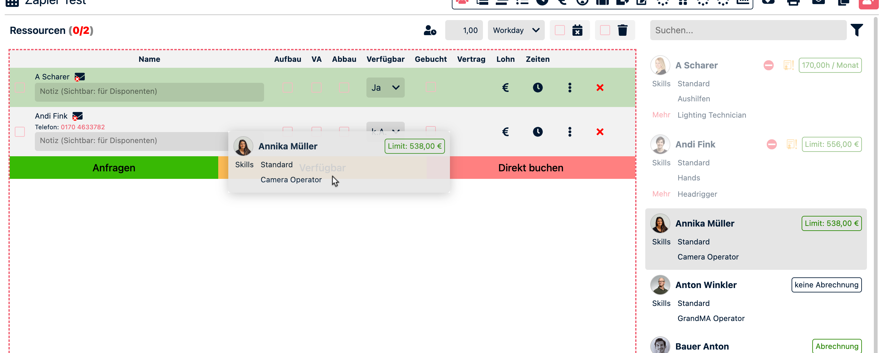 Ziehen Sie Mitarbeiter auf ‘verfügbar’, wenn Sie vorher mit ihnen gesprochen bzw. telefoniert haben und Sie von den Mitarbeitern wissen, dass sie für diesen Job verfügbar wären. Die Mitarbeiter sind aber noch nicht fest gebucht. Sie haben noch nicht entschieden, ob dieser Mitarbeiter den Job wirklich machen soll. Sie müssen dem Mitarbeiter daher auch erstmal keine Mail senden, weil Sie ja bereits mit ihm kommuniziert haben. In einem weiteren Schritt entscheiden Sie dann, ob Sie diesen Mitarbeiter fest buchen oder nicht.