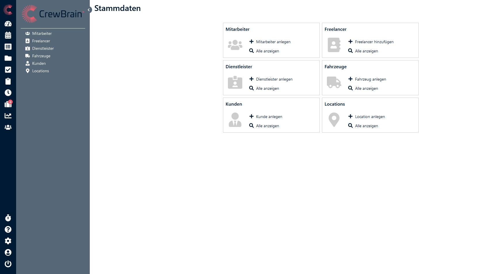 In den Stammdaten können Sie Mitarbeiter, Freelancer, Dienstleister, Fahrzeuge, Kunden und Locations erfassen. Sie können sich so einen Datenpool anlegen, auf den Sie beim Erstellen von Projekten und Jobs jederzeit zugreifen können. Je nach Zugriffsrechten können die Mitarbeiter, Freelancer oder Dienstleister ihre Daten selber einspeisen. Dadurch baut sich Ihr Datenpool schnell von selbst auf. Falls Sie die Daten Ihrer Mitarbeiter bereits in einer Excel-Datei gespeichert haben, können Sie diese in den jeweiligen Stammdaten (Mitarbeiter, Kunden, Locations, usw.) mit Hilfe einer einfachen Import-Möglichkeit für Excel- oder CSV-Listen hochladen. Der Import ist frei konfigurierbar und funktioniert somit mit beliebigen Eingabeformaten.
