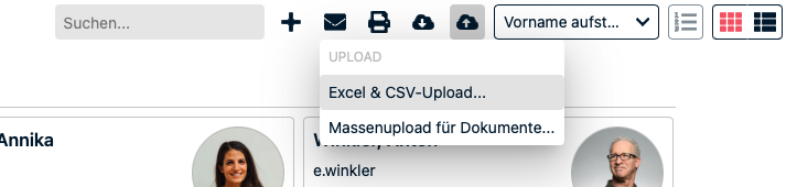 Öffnen Sie zunächst die Stammdaten z.B. Mitarbeiter, Freelancer, oder Kunden, für die Sie den Import vornehmen möchten. Oben rechts sehen Sie das Wolkensymbol mit dem nach oben gerichteten Pfeil. Klicken Sie darauf und wählen Sie "Excel & CSV-Upload..." um den Upload-Dialog zu öffnen. Sie haben während des gesamten Vorgangs immer die Möglichkeit zurück in das vorherige Fenster zu springen oder den Upload abzubrechen.