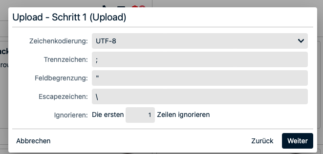 Laden Sie eine CSV-Datei hoch, werden Sie nun nach der Codierung der Datei gefragt, sowie welche Zeile ignoriert werden soll, z.B. die Titelzeile.