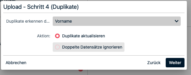 Jetzt werden Sie danach gefragt, anhand welcher Information CrewBrain auf Duplikate mit Ihren bestehenden Stammdaten prüfen soll und wie mit den Duplikaten verfahren werden soll.