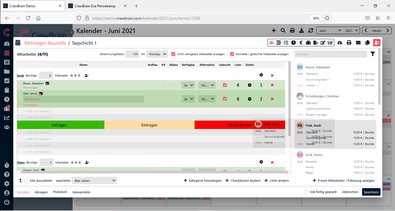 Wenn Sie einen Mitarbeiter "direkt buchen", ist dieser im System als "fest gebucht" für den Job eingetragen. Dies ist beispielsweise für festangestellte Mitarbeiter.