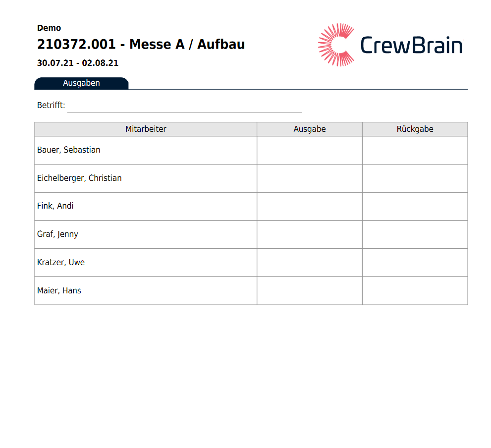 Wenn Sie Ihren Mitarbeitern für bestimmte Jobs Material (z.B. T-Shirts) aushändigen, können Sie sich über CrewBrain Listen ausdrucken, in der die Mitarbeiter eintragen können, wann sie das Material erhalten und wann sie es zurückgegeben haben. Die Mitarbeiter müssen dafür fest auf den Job gebucht sein.