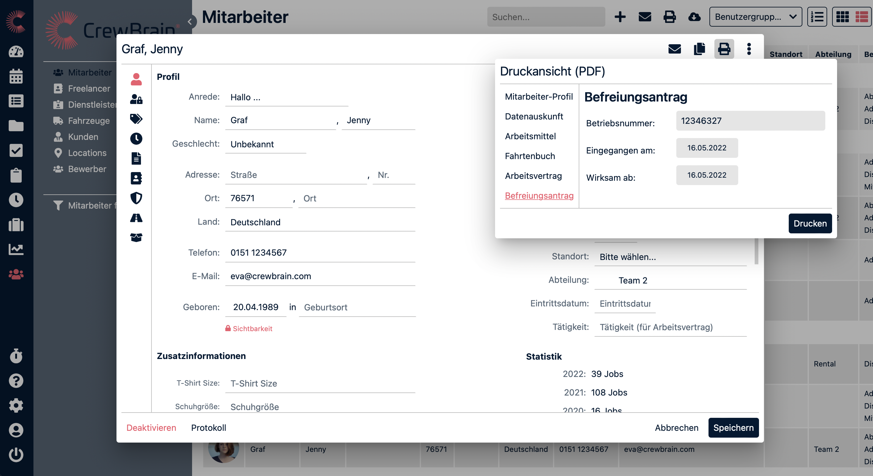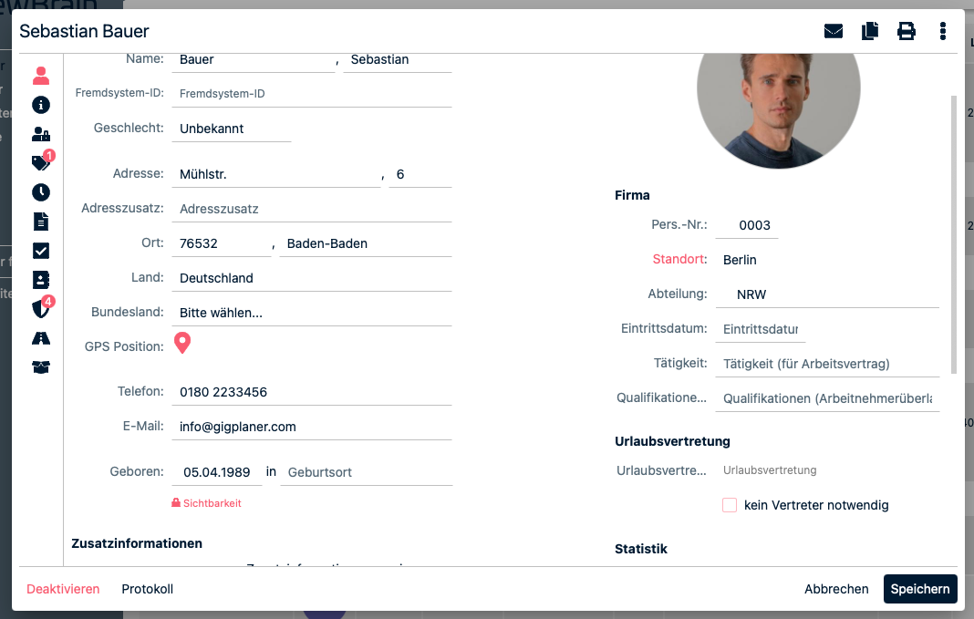 Geben Sie hier die persönlichen Informationen des Mitabeiters ein. Füllen Sie dazu die vorgegebenen Felder aus. Mit dem optionalen Adresszusatz können auch internationale Adressen gut erfasst werden. Unter Verwaltung > Mitarbeiter > Zusatzinformationen können weitere Datenfelder angelegt werden. Sie können Sprachen und Notizen hinterlegen, sowie ein Foto des Mitarbeiters hochladen. Außerdem sehen Sie hier die Personalnummer und können Ihren Mitarbeiter ggf. einem Standort oder einer Abteilung zuweisen.Arbeiten Sie beim Urlaub mit unserer Vertreterfunktion (Verwaltung > Urlaub & Abwesenheit > Allgemein) können Sie hier einen Standart-Vertreter definieren, der dann beim Urlaubsantrag automatisch als Vertreter gesetzt. Dieser Vertreter erhält dann den entsprechenden Antrag, bevor er zur finalen Genehmigung an die vorgesetzte Person geht. Alternativ kann hier auch angeben werden, wenn in dem speziellen Fall kein Vertreter benötigt wird. Unter “Statistik” kann man sich die einzelnen Jobs eines Mitarbeiters pro Jahr anschauen, indem man auf die Jobs klickt.