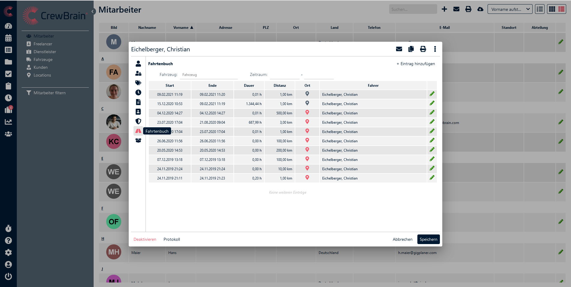 Hier erhalten Sie einen Überblick über das Fahrtenbuch Ihrer Mitarbeiter mit Start und Endzeit, der Dauer, der Distanz und dem Ort (sofern er über GPS ermittelt wurde). Unter bearbeiten können Sie den Eintrag im Nachhinein ändern. Alternativ können Fahrten auch über die Stempeluhr erfasst werden.