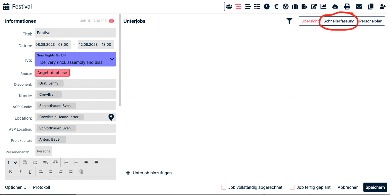 Ob von Projekt- auf Hauptjob-Ebene oder von Hauptjob- auf Unterjob-Ebene, das Anlegen der jeweils unteren Ebene erfolgt immer gleich, und zwar über die Schnellerfassung. Dort kann man dann schnell, viele weitere Unterjobs anlegen indem man nur den Titel, das Datum und rechts den Personalbedarf eingibt. Geht man unten über "+ Unterjob hinzufügen" öffnet sich eine komplett neue Maske, in der man für jeden weiteren Unterjob alle Informationen erneut eingeben muss. Das ist nicht unbedingt zeitsparend kann aber Sinn machen, wenn die Jobinformationen von Job zu Job sehr unterschiedlich sind.