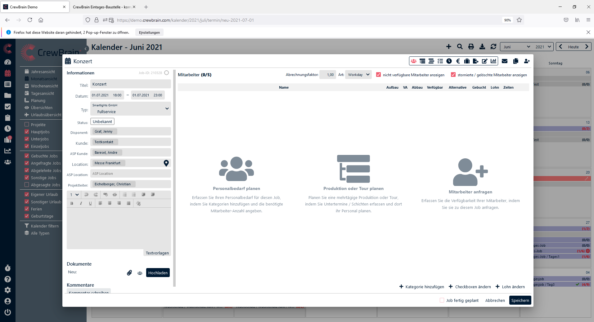 Auf der linken Seite der Maske werden als erstes alle Job relevanten Informationen eingegeben. Dazu gehören der Titel, das Datum, der Typ und der Status. Typ und Status können unter Verwaltung > Jobs > Job-Typen bzw. Job-Status individualisiert werden.
