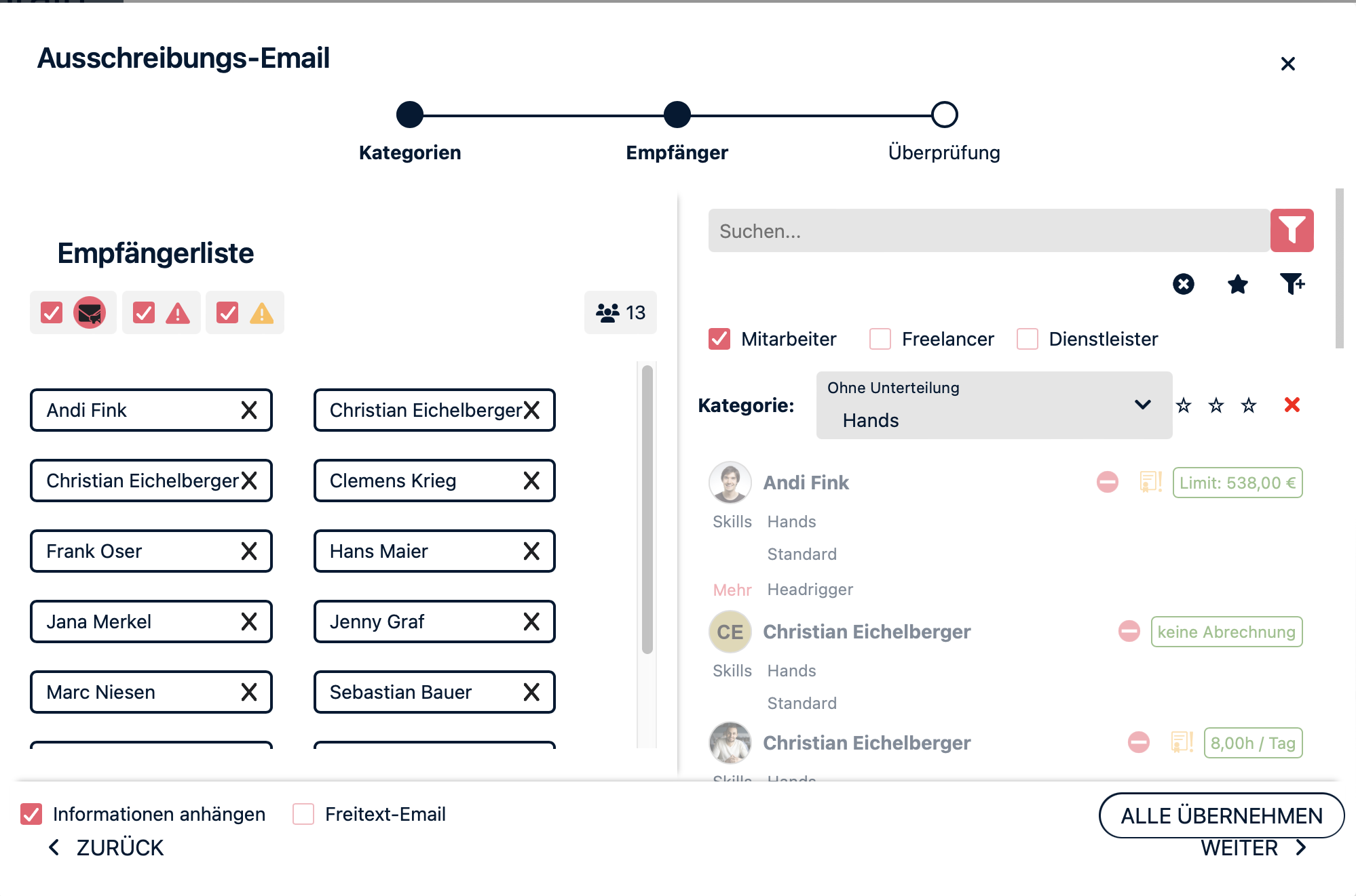 Wollen Sie für einen Job alle Mitarbeiter, Freelancer und / oder Dienstleister der benötigten Kategorien auf einmal anfragen, dann senden Sie ihnen hier eine Ausschreibungs-Email. Treffen mehrere Kategorien für eine Person zu, so wird nur eine E-Mail für den Job mit allen Kategorien Versand. Die Empfänger der Ausschreibung können sich nun im Job aktiv anbieten und so auf die Ausschreibung antworten. Anschließend kann der Disponent oder Projektleiter wählen, welche dieser Personen er final buchen möchte.