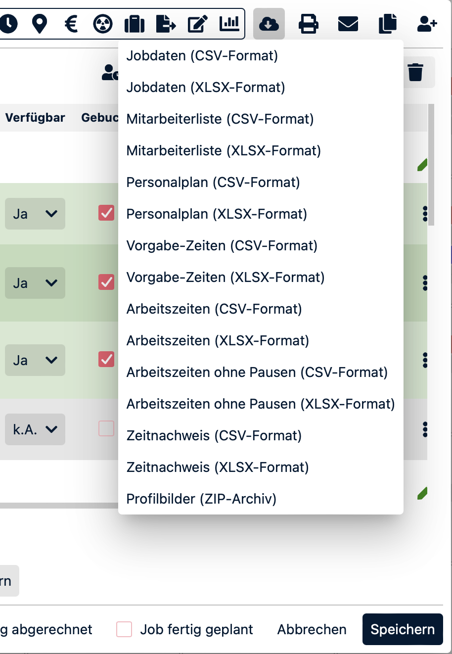 Wenn Sie einen Job angelegt haben, Mitarbeiter dazu angefragt, eingetragen oder gebucht haben und dann auf "speichern" klicken, können Sie sich über die Druckansicht oben rechts veschiedene Mitarbeiterlisten ausgeben lassen. Dazu gehören eine Jobübersicht, ein Personalplan, die Statistik, Unterschriftenlisten, Ausgabelisten, Meldelisten, Zeitnachweise, Aufgabenlisten, Auftragsbestätigungen und eine Liste für Covid-19 Tests. Bei fast allen Listen können Sie auswählen, welche Informationen enthalten sein sollen.