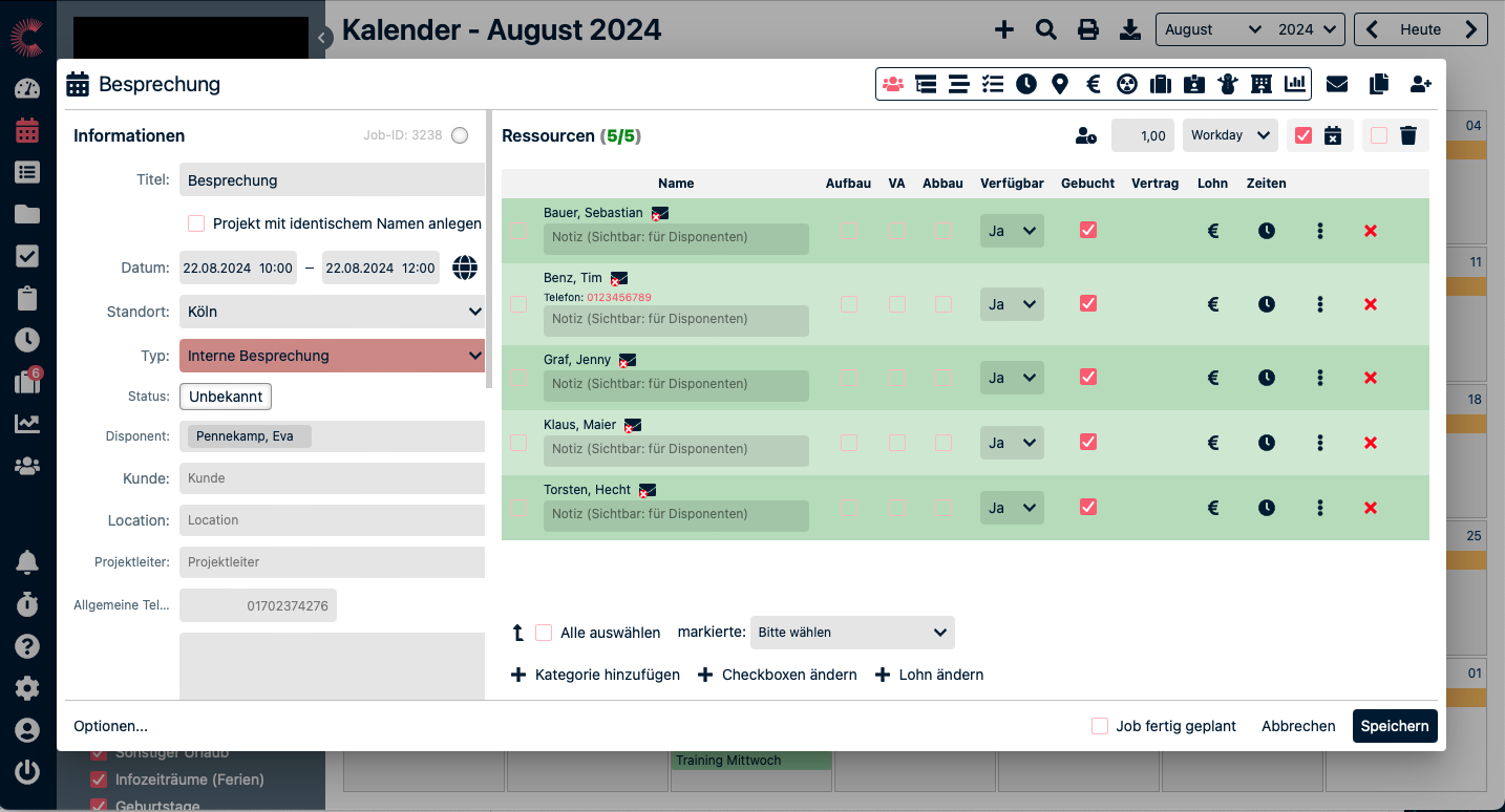 In jedem Job können Sie Mitarbeiter anfragen, verfügbar setzen oder direkt buchen.