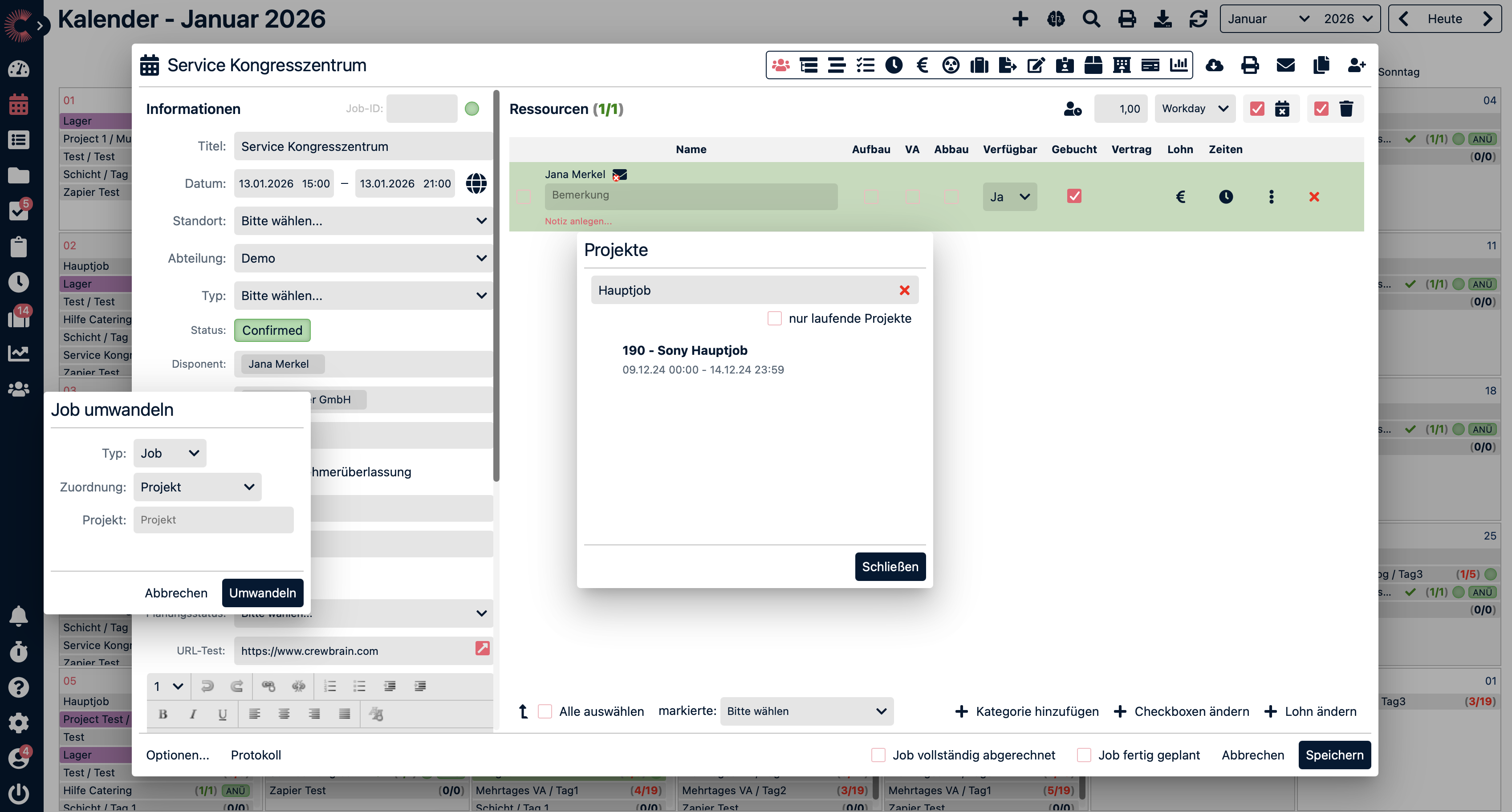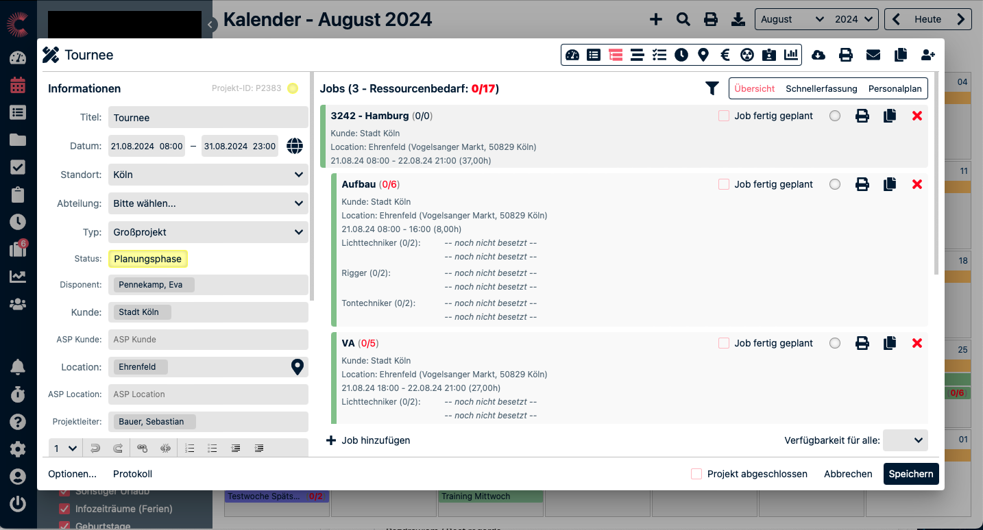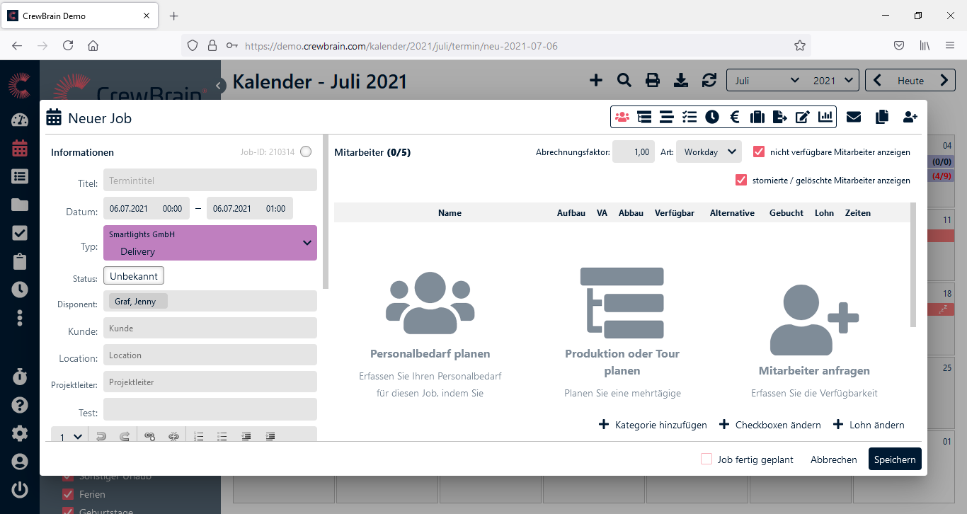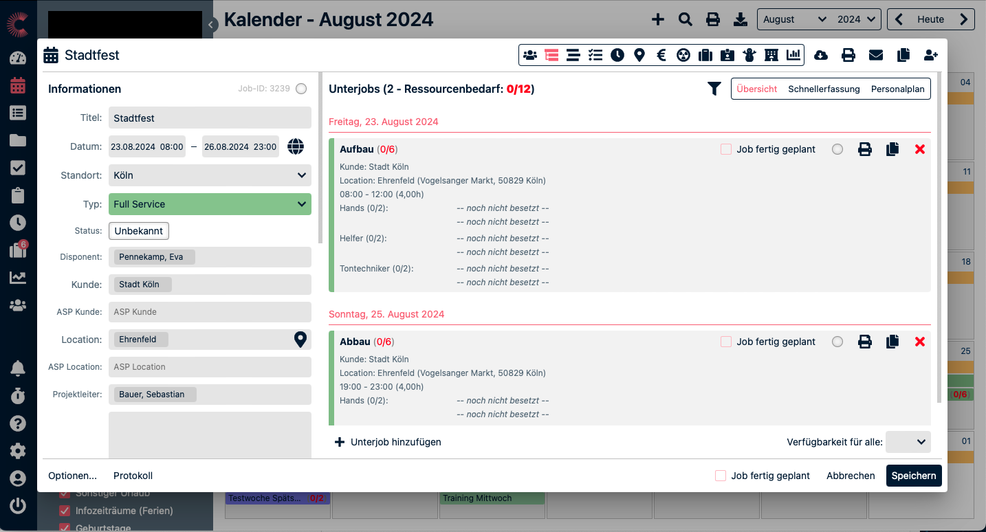 Jobs legen Sie an, indem Sie entweder im Kalender auf ein Datum klicken - wenn das nicht unter Verwaltung > Kalender > Allgemein auf Projekte geändert wurde - oder indem Sie oben rechts auf das Plus klicken und einen Job anlegen. In beiden Fällen öffnet sich eine Maske, in der Sie den kompletten Job inklusive Personal, Unterjobs, Zeiterfassung u.v.m. erstellen können.