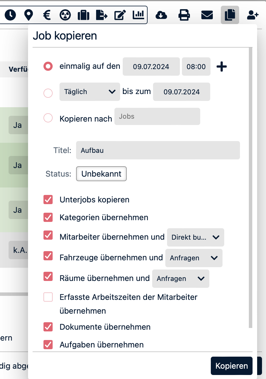 Sie können dabei einen Titel wählen und auswählen, was genau übernommen werden soll. Unter anderem können Sie wählen ob die Unterjobs, die Mitarbeiter oder Dokumente übernommen werden sollen. Auch der Job-Status kann individuell gewählt werden.
