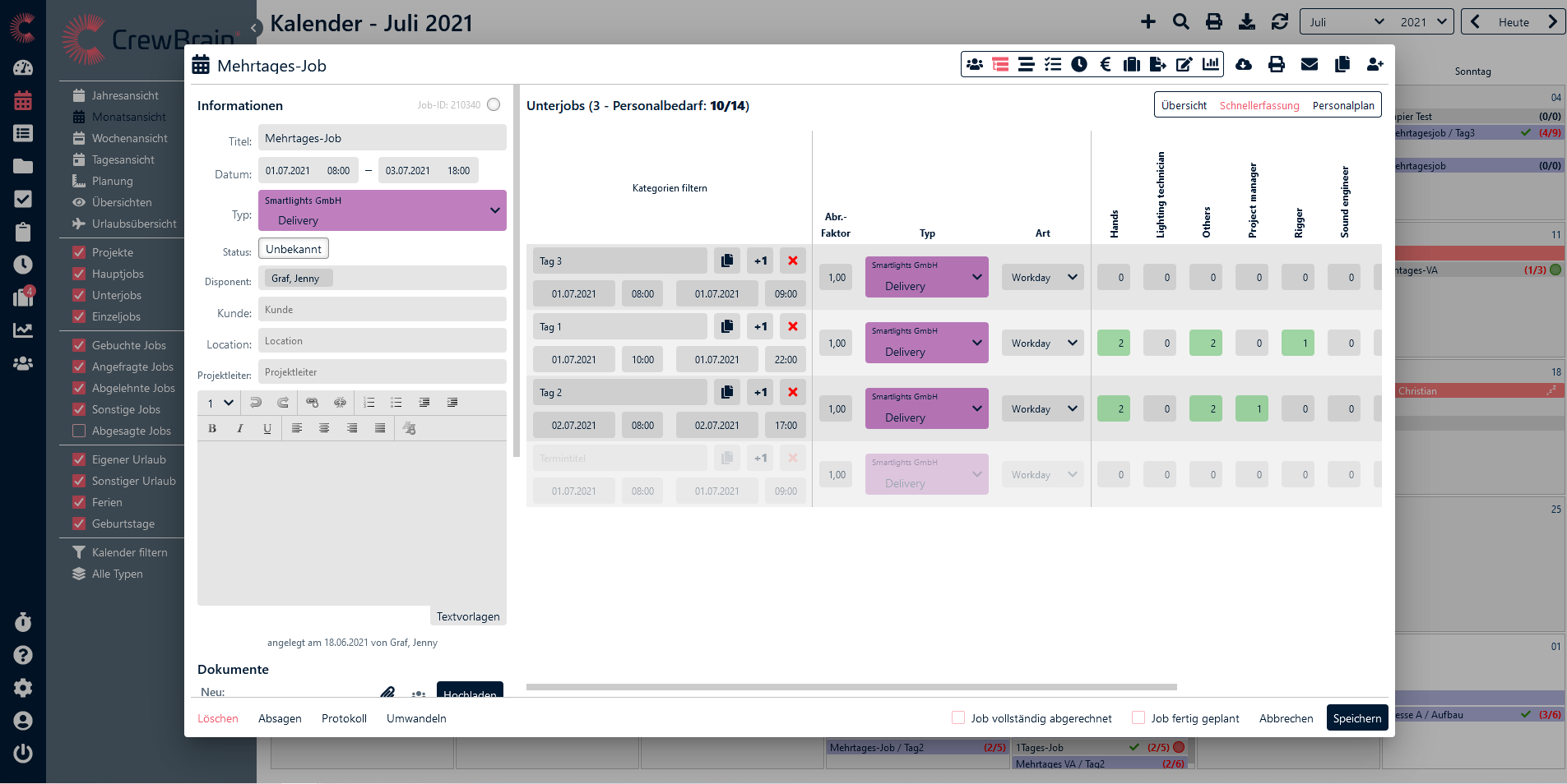 Ein Beispiel wäre hier der Auf- und Abbau eines Events. Als Hauptjob hätte man dann den Namen der VA mit der kompletten Zeit, also mit den Zeiten von Auf- und Abbau. Die Unterjobs wären dann einmal der Aufbau und der Abbau, die zu unterschiedlichen Zeiten stattfinden.