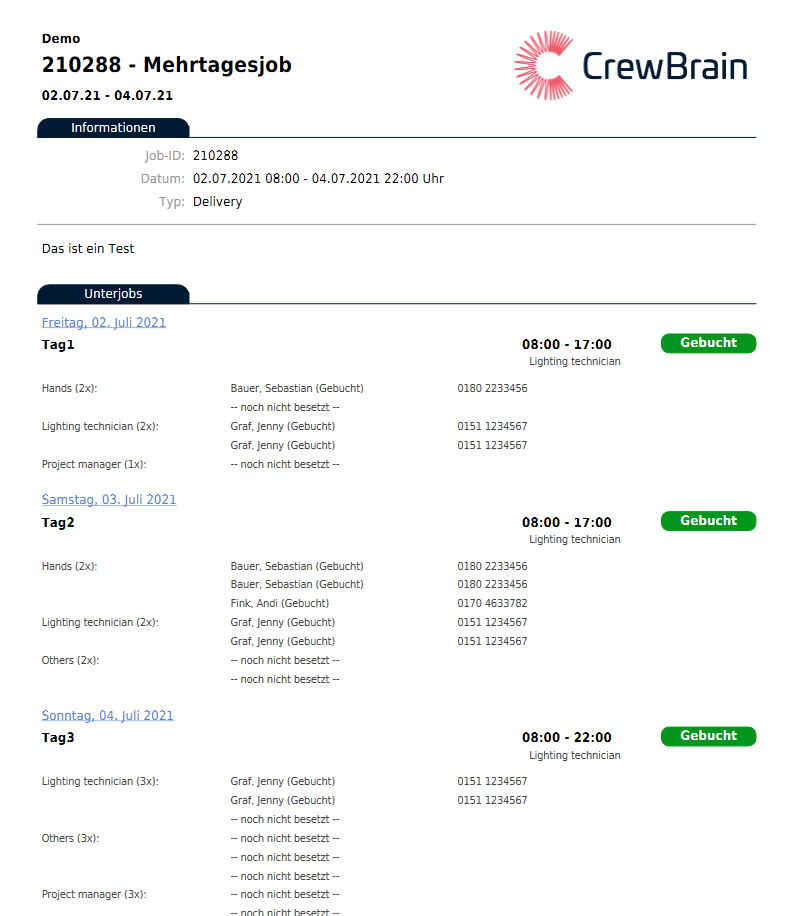 Sie können sich oder Ihren Mitarbeitern eine Jobübersicht ausdrucken. Diese enthält neben den Informationen des Hauptjobs und ggf. der Unterjobs auch Informationen wie bsplw. Arbeitszeiten, Mitarbeiter, Telefonnummern der Mitarbeiter oder auch Bemerkungen und Kommentare. Welche Informationen angezeigt werden, können Sie selber wählen. Die Beschreibung wird für Unterjobs allerdings nur ausgegeben, wenn sie von der Beschreibung des Hauptjobs abweicht. Gehen Sie wie folgt vor: