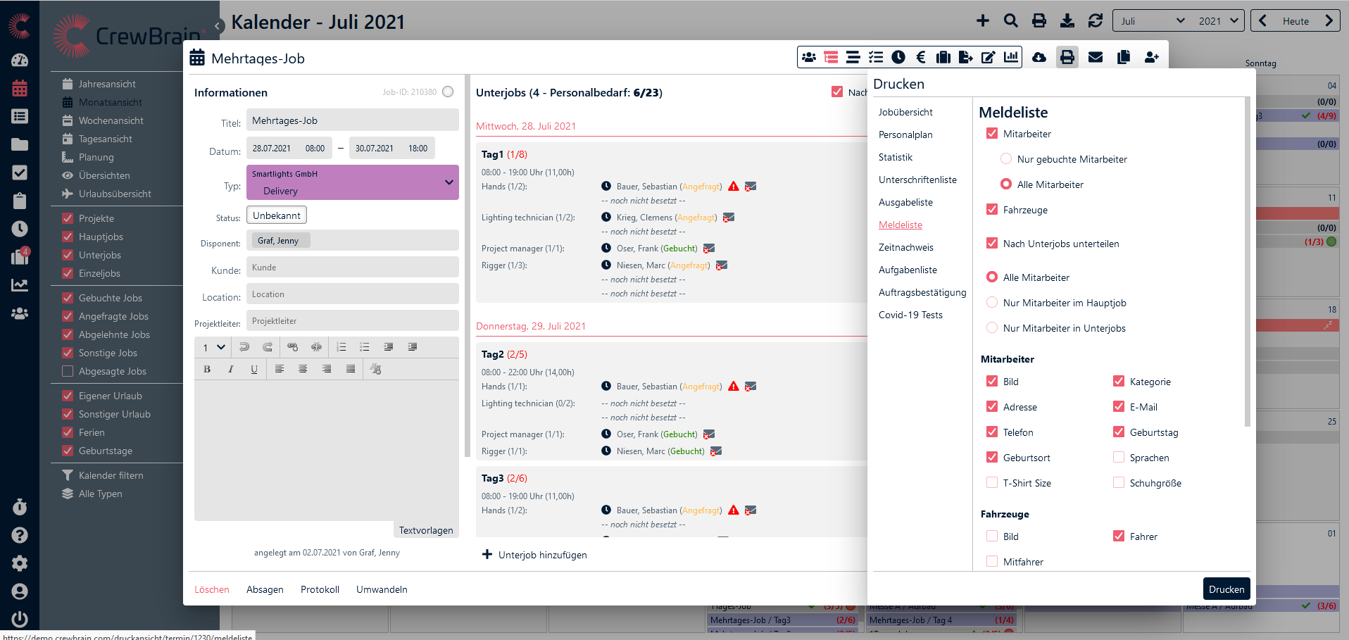 Wenn Sie einen Job angelegt haben, Mitarbeiter dazu angefragt, eingetragen oder gebucht haben und dann auf "speichern" klicken, können Sie sich über die Druckansicht oben rechts verschiedene Mitarbeiterlisten ausgeben lassen. Dazu gehören eine Jobübersicht, ein Personalplan, die Statistik, Unterschriftenlisten, Ausgabelisten, Meldelisten, Zeitnachweise, Aufgabenlisten, Auftragsbestätigungen, der QR-Code für die Stempeluhr und eine Liste für Covid-19 Tests.