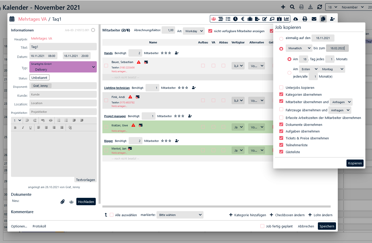 Da man in CrewBrain keine Vorlagen erstellen kann, lösen wir dieses Problem mit Hilfe der Kopierfunktion. Sollen sich also bestimmte Jobs wiederholen, können Sie diese oben rechts kopieren. Die Intervalle können Sie dabei selber bestimmen. Von einmalig bis täglich, wöchentlich, monatlich, jährlich oder beispielsweise jeden zweiten Dienstag eines Monats.