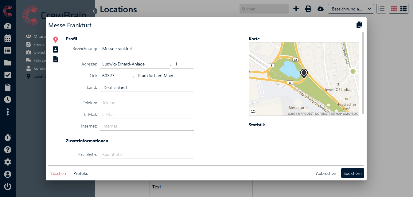 Auch Locations können in den Stammdaten gespeichert werden. Somit können Sie direkt in die Projekte integriert werden und jeder Mitarbeiter sieht direkt, wo das Projekt bzw. sein Job stattfindet.