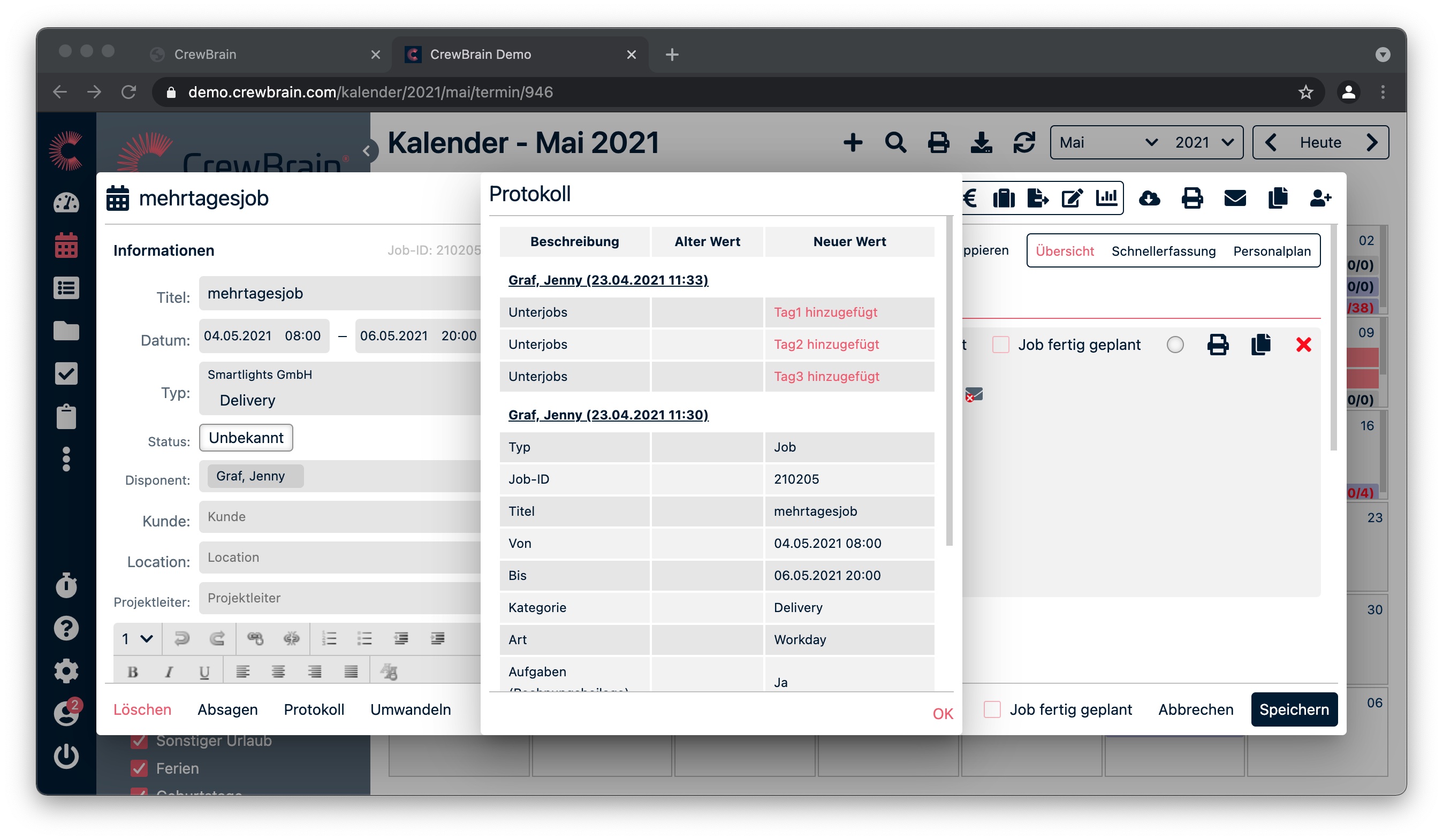 Hier werden Änderungen an den Stammdaten, Jobs, Aufgaben und vielen weiteren Objekten protokolliert. Das Protokoll zeigt in einer klaren Übersicht alle relevanten Informationen, eventuelle Änderungen und wer diese Informationen wann angelegt hat. Somit können Sie nachvollziehen, welche Änderungen wann und von wem vorgenommen wurden. Das Protokoll ist in jedem Bereich (Aufgabe, Jobs, Stammdaten, usw.) zu finden (meist unten links in einer Ansicht).