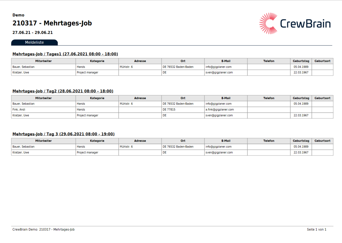 Für die polizeiliche Überprüfung Ihrer Mitarbeiter (z. B. bei offiziellen Veranstaltungen mit Politikern) brauchen Sie Meldelisten. Diese können Sie ganz einfach in CrewBrain erstellen:
