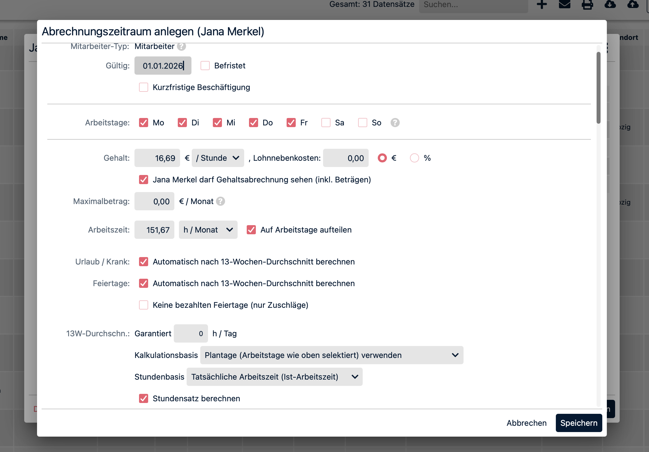 Öffnen Sie im Profil des Mitarbeitenden bitte den Menüpunkt “Abrechnung & Zeiterfassung”. Wählen Sie nun “Neuen Abrechnungszeitraum anlegen”. Als Abrechnungsart hinterlegen Sie nun “Arbeitszeiterfassung mit Gleitzeitkonto (Tagesbasiert - neue Logik)”. Nachdem Sie das Startdatum (Zeitpunkt ab dem die Konfigurationen in diesem Abrechnungszeitraum gelten sollen) gesetzt haben, haken Sie die regelmäßigen Arbeitstage pro Woche an. In diesem Beispiel 5 von 7 (Mo - Fr). Nun tragen Sie den Stundenlohn nach Entgelttabelle laut DGB/GVP-Tarifvertrag ein. In der Zeile “Arbeitszeit” hinterlegt Sie die monatliche Soll-Arbeitszeit von 151,67 Stunden (bei Vollzeitbeschäftigung) und setzen dann den Haken bei “auf Arbeitstage aufteilen”. Weiterhin haken Sie die Berechnung nach dem 13-Wochenschnitt an für Urlaub, Krank und Feiertage. Unterhalb können Sie dann noch weitere Spezifikationen zum 13-Wochenschnitt berechnen, z.B. die Kalkulationsbasis (sollen die Plantage oder die tatsächlich gearbeiteten Tage als Kalkulationsbasis herangezogen werden?) und die Stundenbasis (Soll-Stunden oder Tatsächliche Arbeitszeit?).