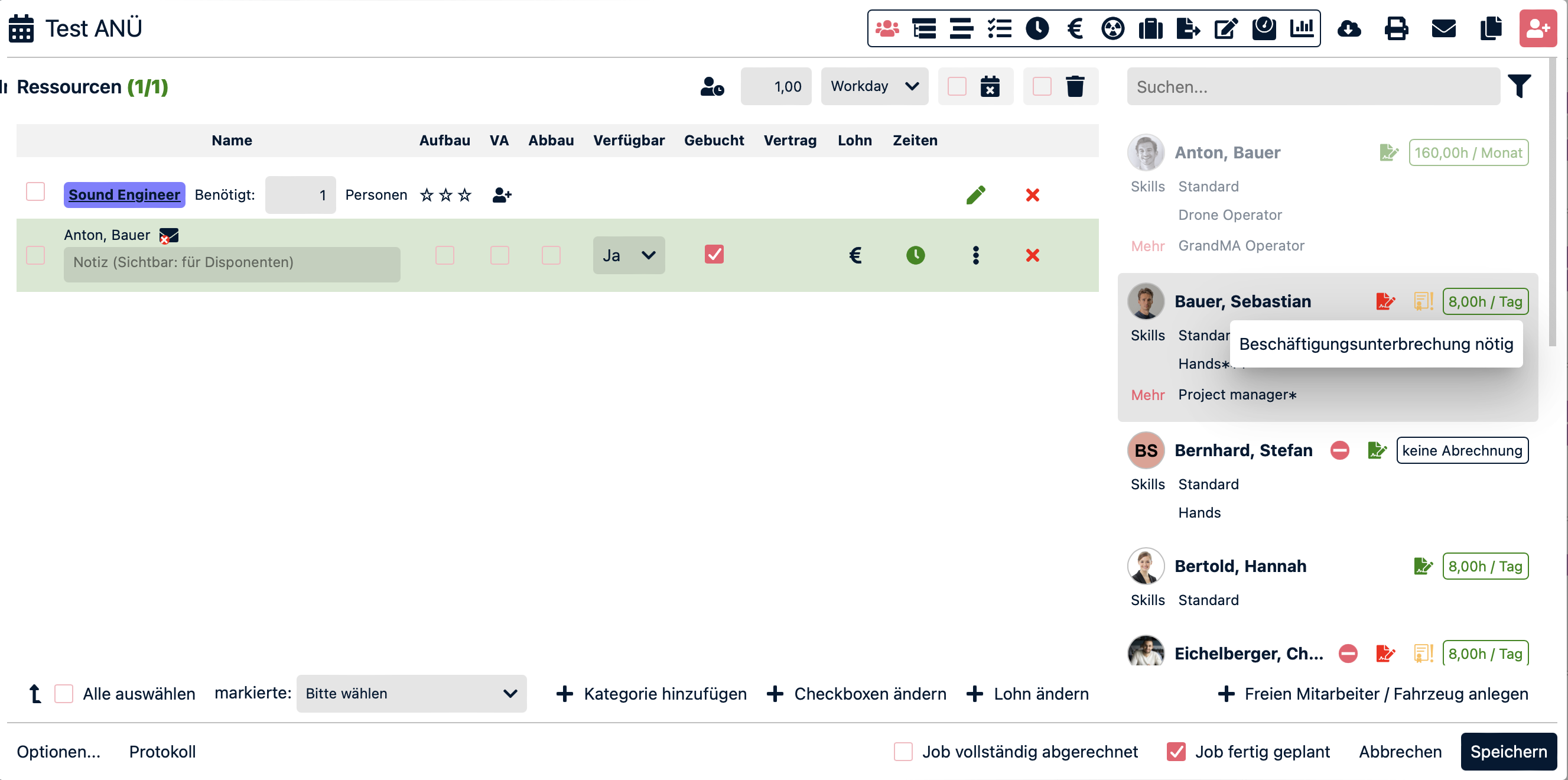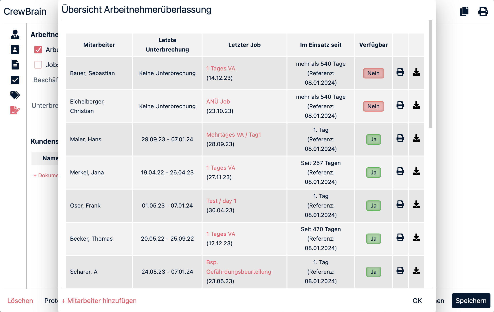 Wird nun der so angelegte Kunde in den Job-Informationen ausgewählt und setzt man den Haken bei "Arbeitnehmerüberlassung", dann sieht man beim Anfragen der Mitarbeiter bestimmte ANÜ-Hinweise. Zum einen sieht man das Symbol eines Zettels mit einem Stift. Ist dieses grün, dann darf der Mitarbeiter noch für diesen Kunden arbeiten. Durch klicken auf das Symbol wird die Anzahl der noch verfügbaren Tage angezeigt. Ist das Symbol rot, ist eine Beschäftigungsunterbrechung notwendig und der Mitarbeiter darf erstmal nicht mehr für diesen Kunden arbeiten. Zieht man einen solchen Mitarbeiter trotzdem in den Job, sieht man dort als Hinweis ein rotes Ausrufezeichen. Klickt man darauf, gelangt man in die Übersicht der Arbeitnehmerüberlassung des Mitarbeiters und sieht hier eine Auflistung der letzten Jobs und seit wann er oder sie für diesen Kunden im Einsatz ist. Auch hier kann man sich die Daten wieder als PDF oder im CSV- oder XLSX-Format ausgegeben lassen.
