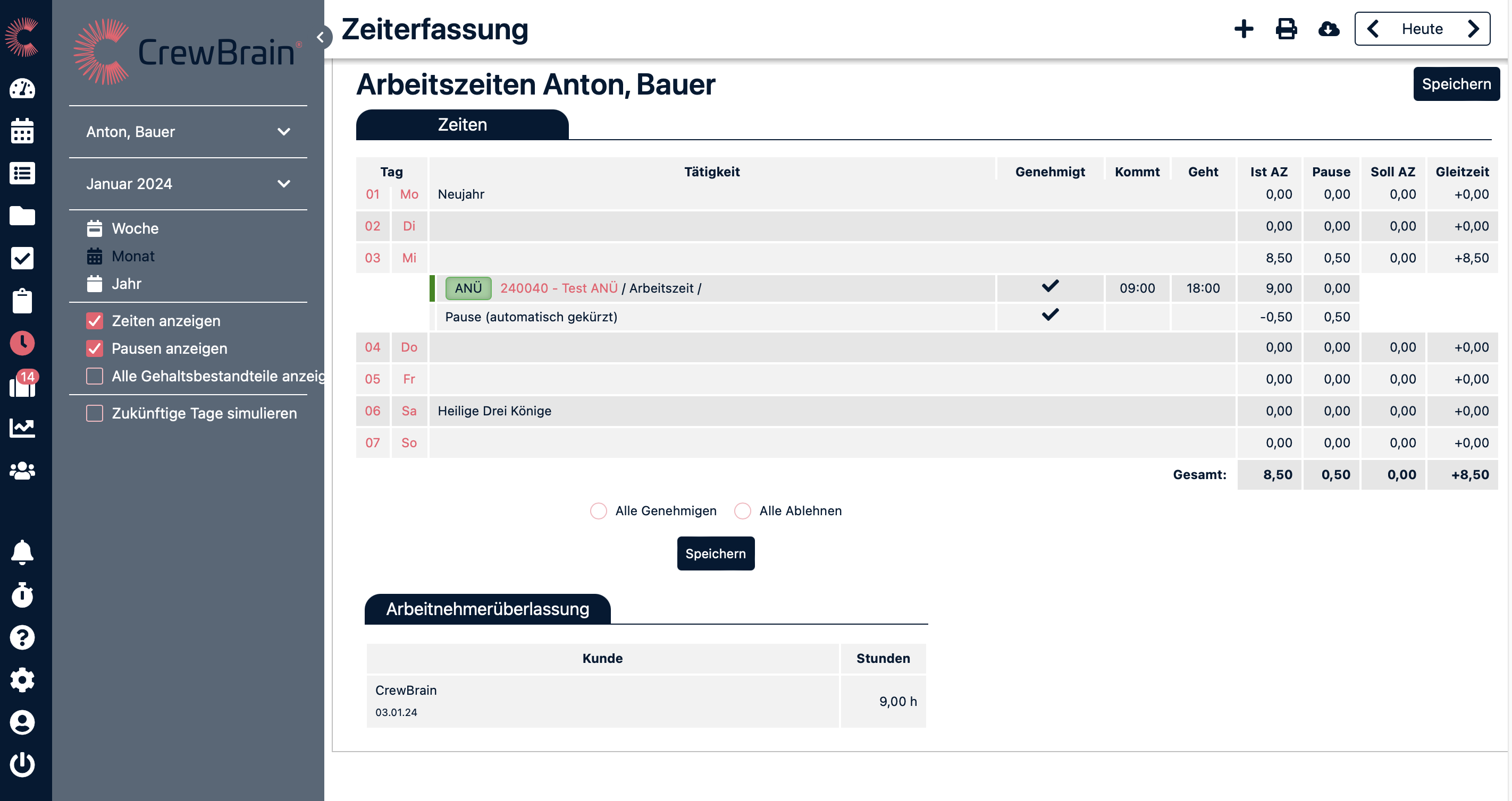Mit dem Feature Arbeitnehmerüberlassung können Sie die Einsatztage Ihrer Mitarbeiter für die einzelnen Kunden direkt beim Buchen oder Anfragen im Blick behalten, um somit die rechtlichen Vorgaben einzuhalten.