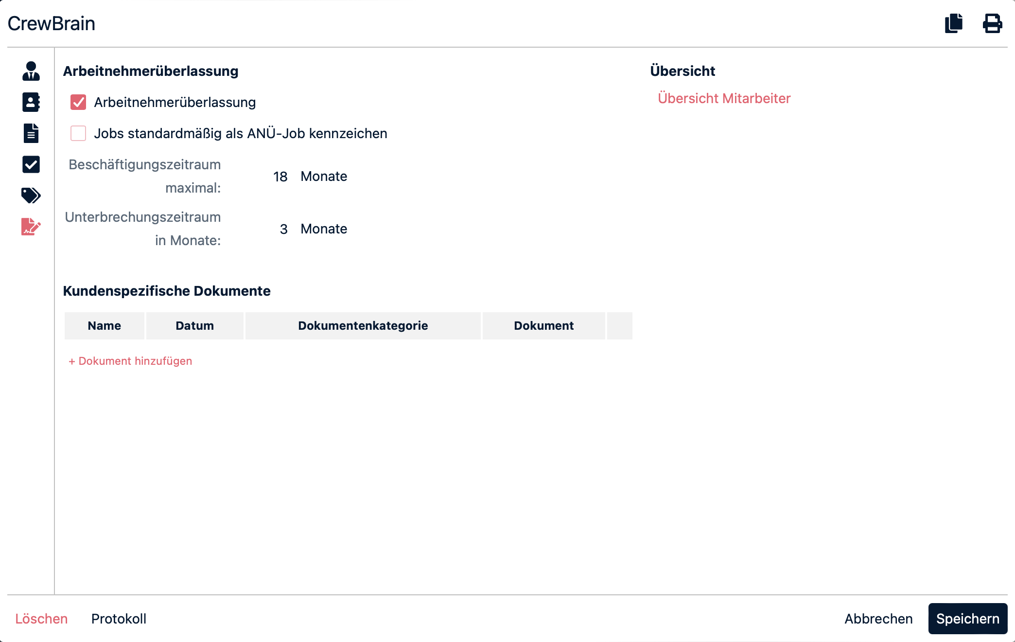 Da die ANÜ bestimmte Dokumente verlangt, wie z.B. die Arbeitnehmerüberlassungsverträge, können diese individuell bei uns erstellt und hier hinterlegt werden. Für das Erstellen solcher Dokumente sprechen Sie bitte unseren Support an.