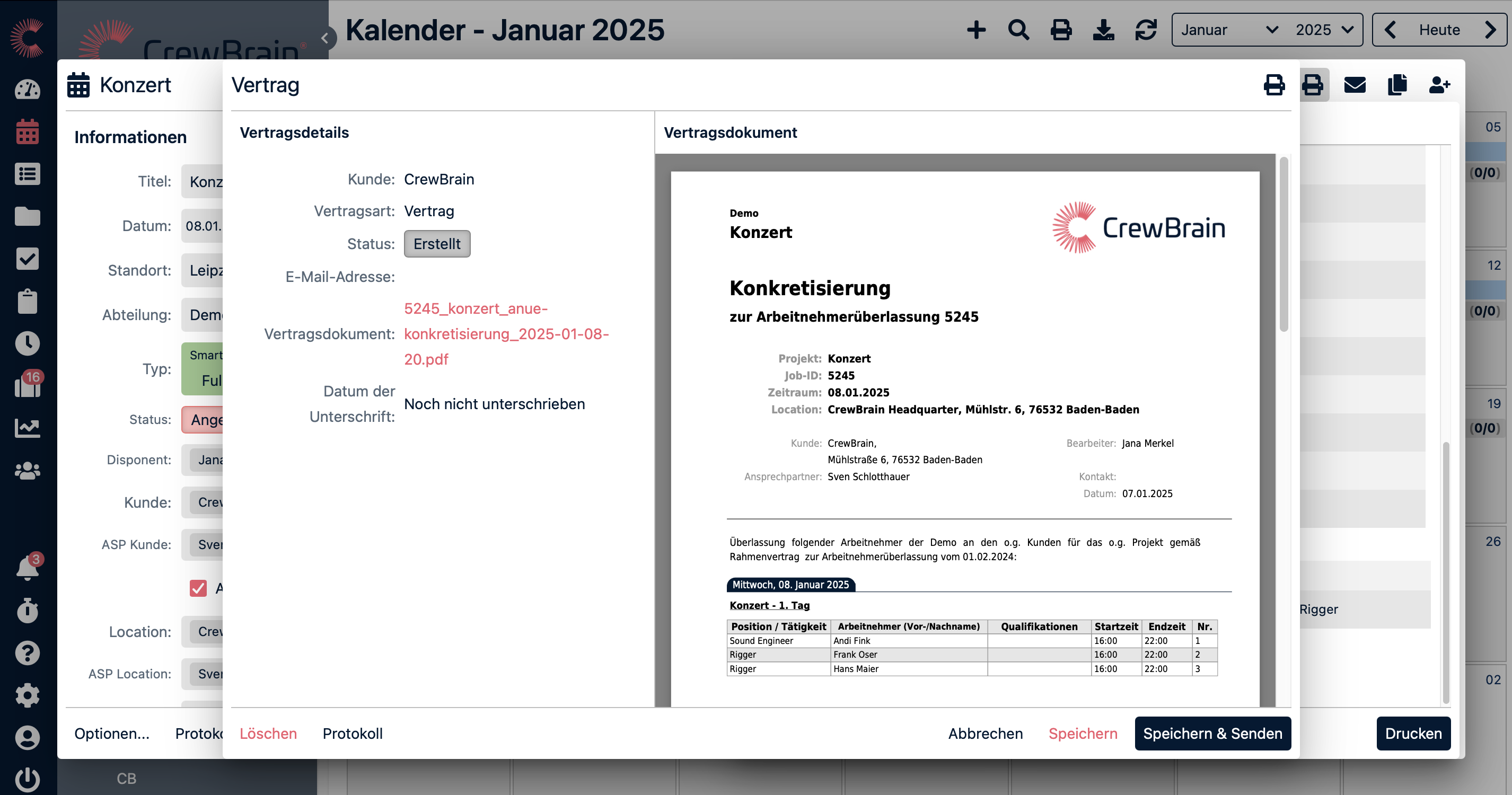 Seit dem 01.01.2025 ist es dank einer Gesetzesänderung möglich, die Verträge für die Arbeitnehmerüberlassung elektronisch zu schließen. Dafür reicht eine einfache digitale Unterschrift aus, die mit CrewBrain erstellt werden kann. Für alle ANÜ-PDFs sowie für die Arbeitsverträge der Mitarbeiter gibt es daher im Druckdialog (aus dem ANÜ-Jobdialog heraus) den Button "Dokument senden". Wird dieser Button gedrückt, wird das PDF erzeugt und in einer Vorschau angezeigt. Anschließend kann das PDF zur Unterschrift an den Kunden oder den Mitarbeiter versandt werden.