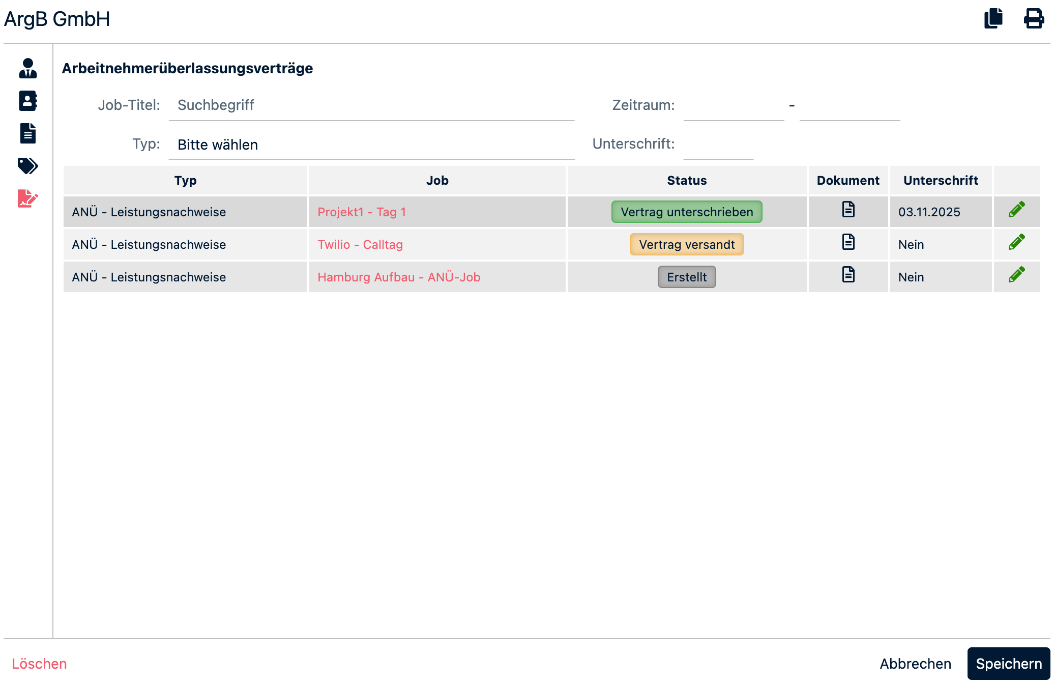 Um gesendete Verträge und deren Status zu sehen, in den jeweiligen Kundendatensatz navigieren und links den letzten Reiter “Arbeitnehmerüberlassung” klicken. Dort findet sich auf der rechten Seite unter “Arbeitnehmerüberlassungsverträge” ein Button, mit dem eine Übersicht über alle Verträge zur ANÜ mit dem jeweiligen Kunden angezeigt wird.