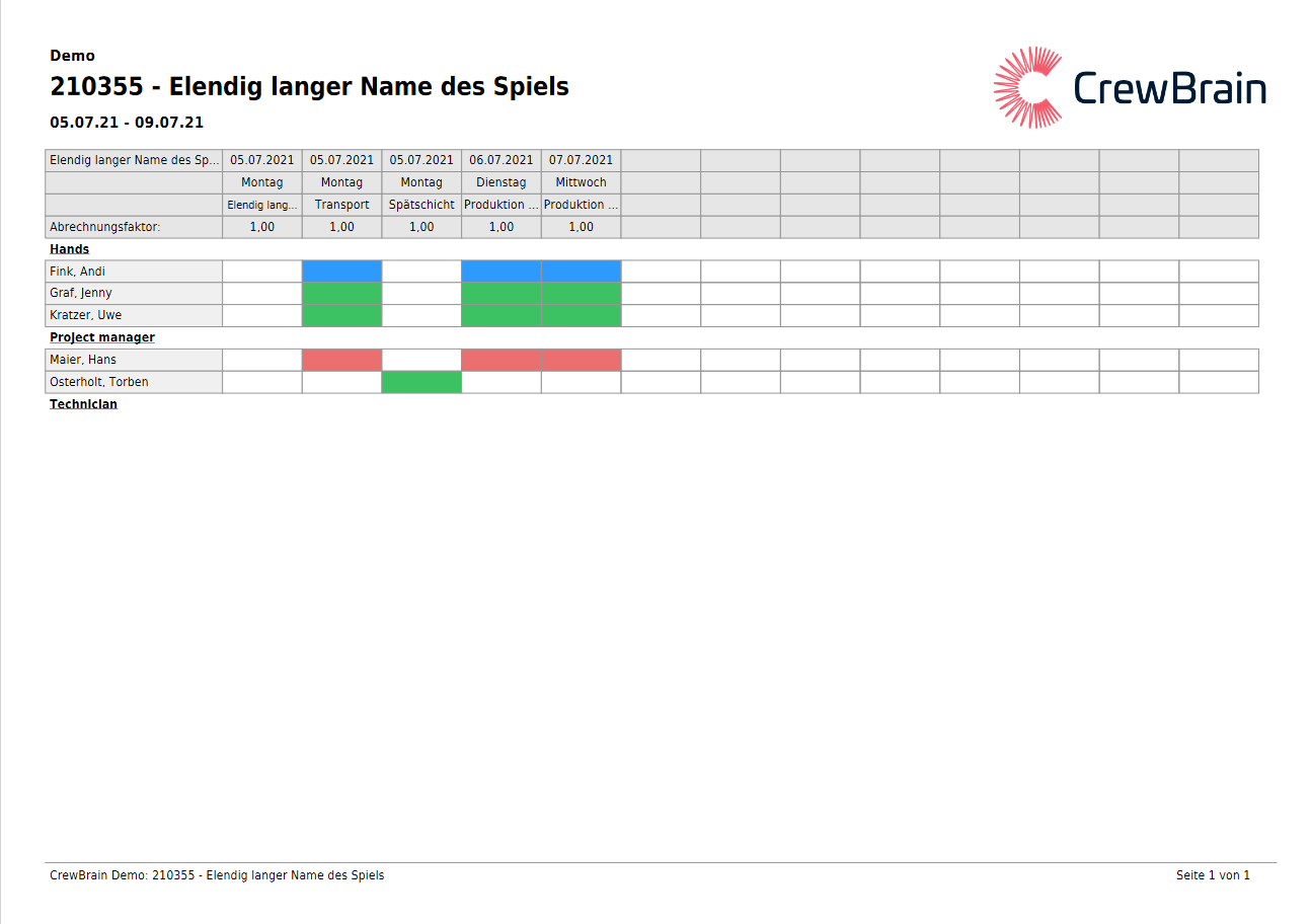 Klicken Sie auf "Drucken", um einen Vorschau zu erhalten, die dann ausgedruckt werden kann. Die verschiedenen Farben geben den Status der Mitarbeiter an (eingetragen/ angefragt/ gebucht).