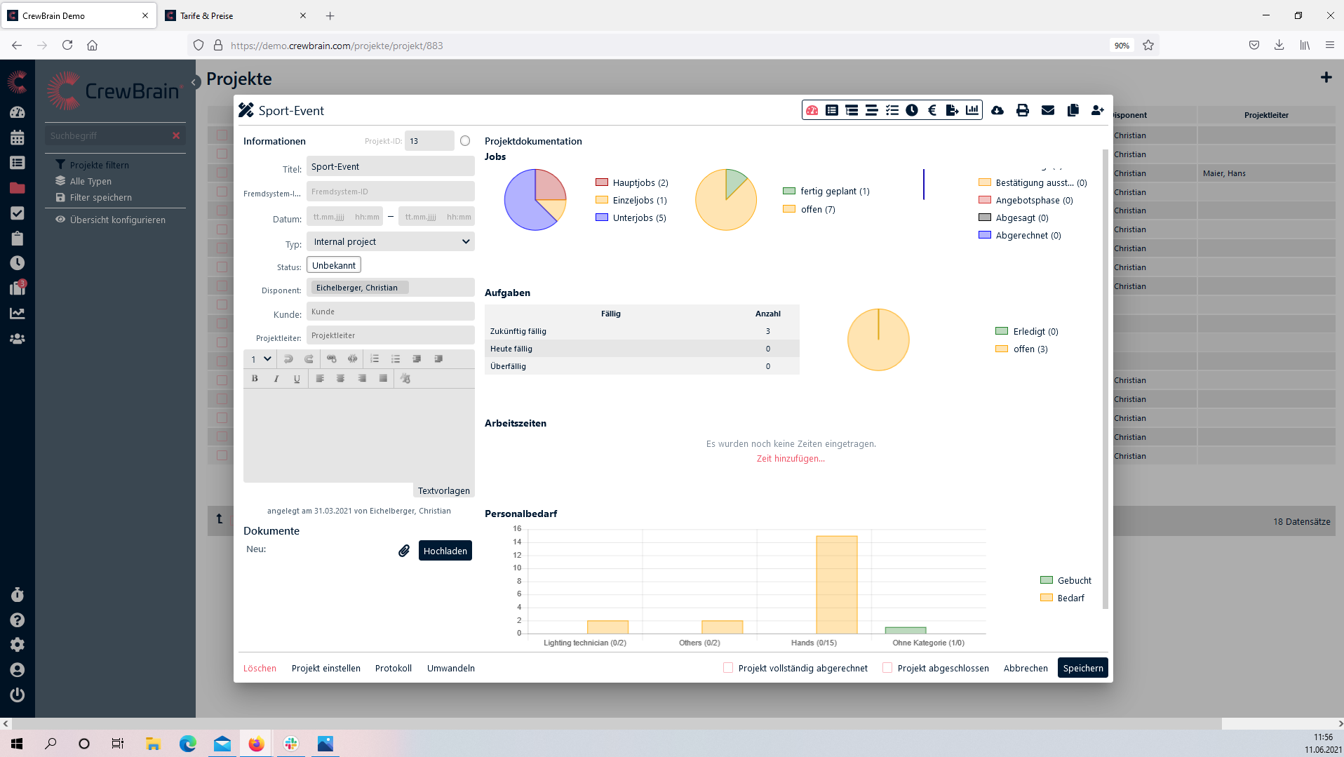 Genau wie bei den Jobs können Sie hier Aufgaben erstellen, Kommentare schreiben und/oder Dokumente hochladen, Rechnungsbeilagen erstellen, Reisekosten angeben, Statistiken anschauen oder individuelle Tabs erstellen.