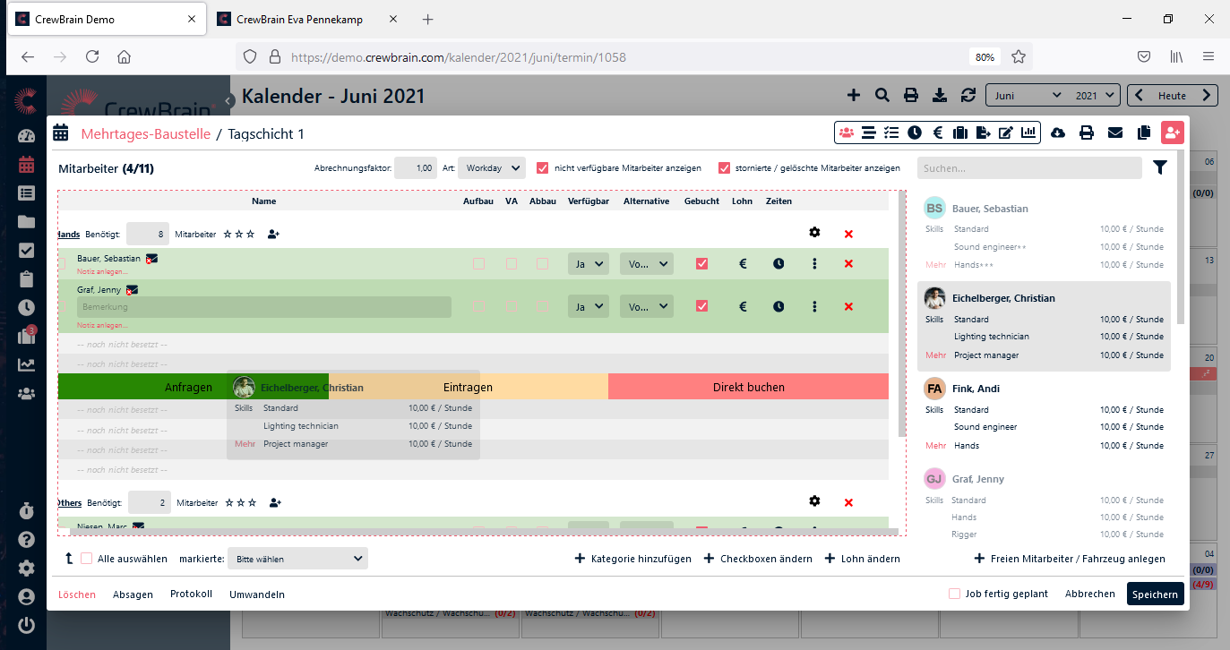 Sie können mehr Mitarbeiter anfragen als vorher in den Kategorien angegeben wurden. Nicht verfügbare Mitarbeiter können mit dem roten "x" am Ende der Zeile wieder aus der Liste entfernt werden. Der entsprechende Mitarbeiter enthält dann automatisch eine E-Mail, dass er aus dieser Kategorie storniert wurde. Um sich die gelöschten oder nicht verfügbaren Mitarbeiter wieder anzeigen zu lassen setzen Sie oben den entsprechenden Haken.