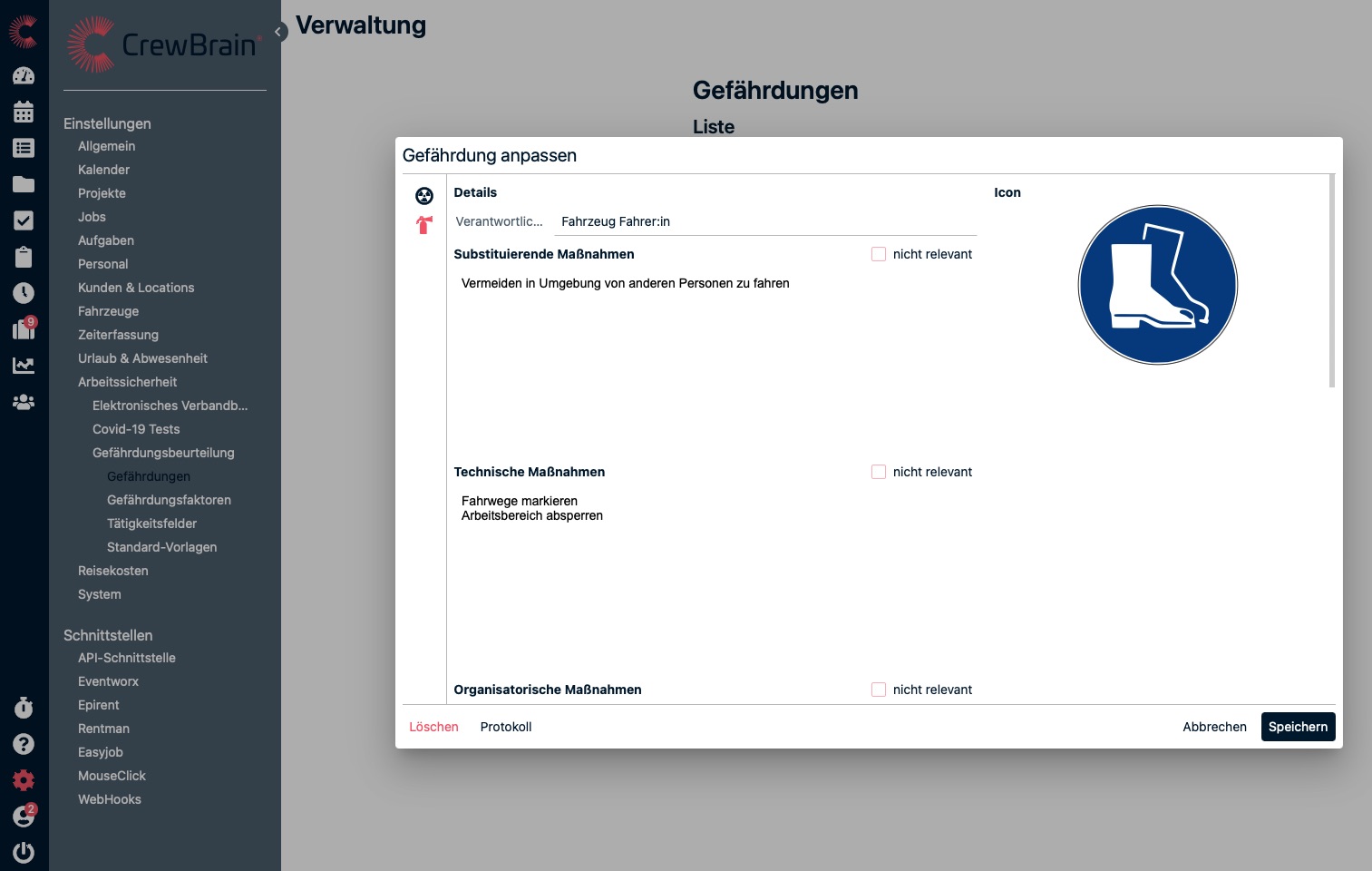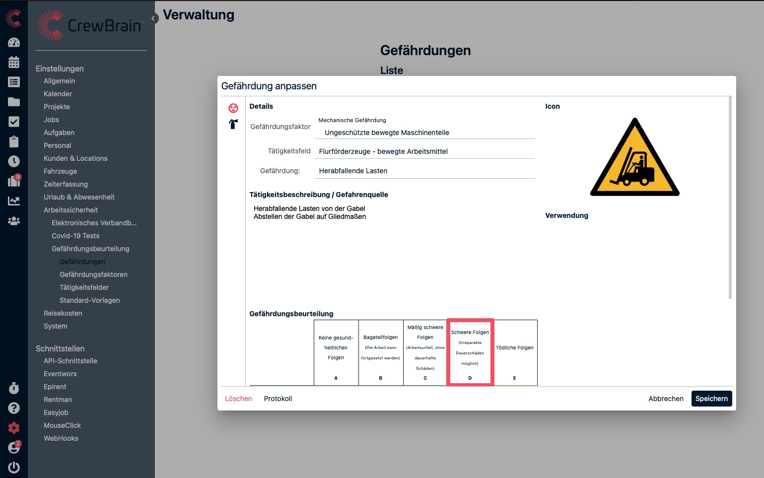 Zunächst muss eine Gefährdung erstellt werden. Dies geschieht unter Verwaltung > Arbeitssicherheit > Gefährdungsbeurteilung > Gefährdungen. Um eine Gefährdung anzulegen, wird der Gefährdungsfaktor sowie ein Tätigkeitsfeld benötigt. Die Gefährdung kann benannt und ein passendes Symbolbild ausgewählt werden. Außerdem sollte die Tätigkeit bzw. die Gefahrenquelle genauer beschrieben werden.
