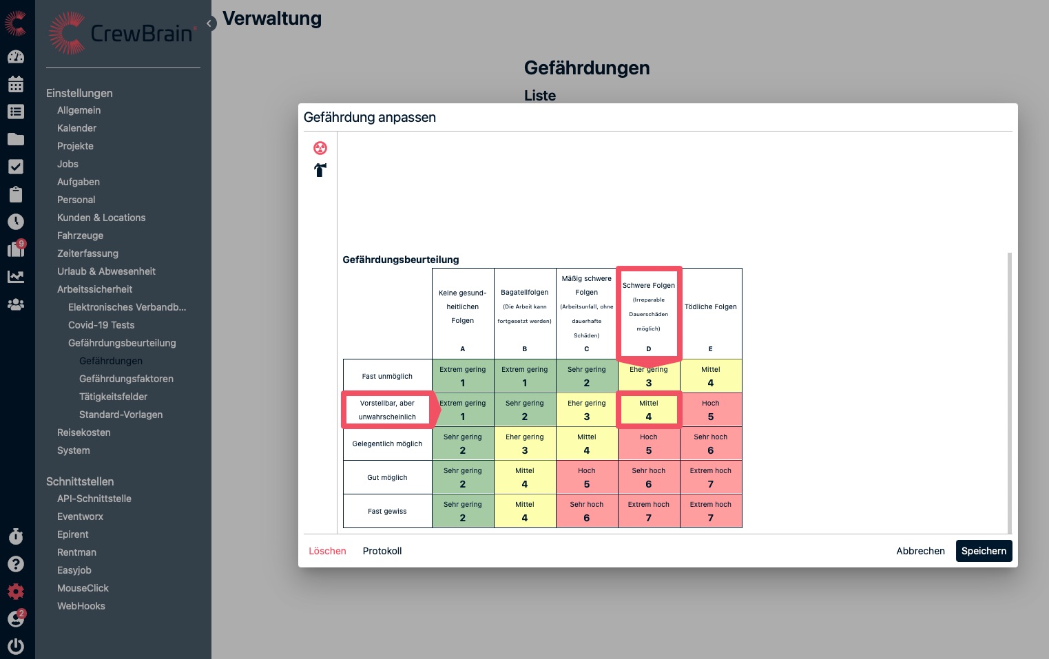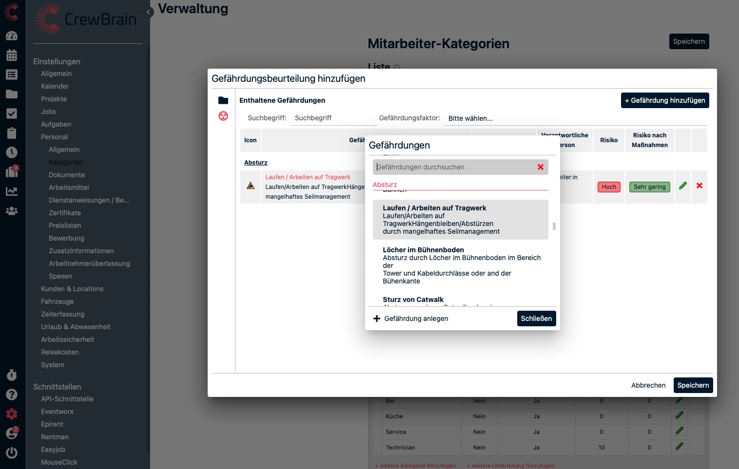 Ein Klick auf das Symbol für die Gefährdungsbeurteilung auf der linken Seite öffnet die Maske, in der die Gefährdung hinzugefügt werden kann. Über den Button "+Gefährdung hinzufügen" wird der angelegte Gefährdungskatalog angezeigt und die passende Gefährdung kann ausgewählt werden. Sobald alle notwendigen Gefährdungen hinzugefügt wurden, sollte der Status von "Erstellt" auf "in Prüfung" (sofern nötig) oder auf "Freigegeben" geändert werden. Nur freigegebene Gefährdungen können nachher im Job verwendet werden. Weitere mögliche Status sind "Überprüfung notwendig" und "Archiviert".