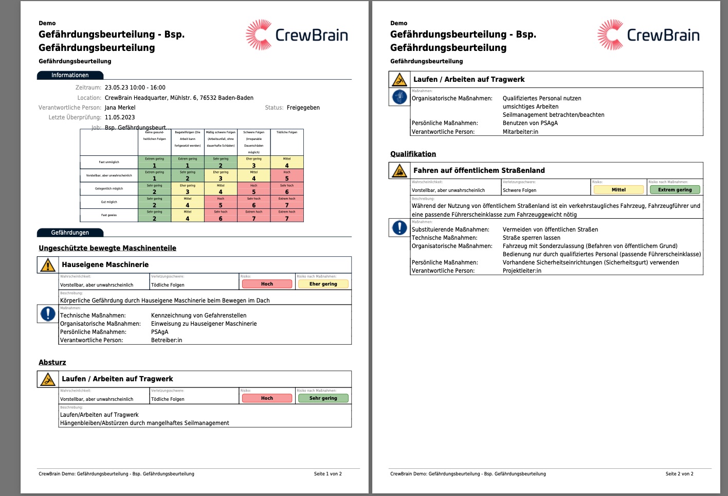 Im Job besteht dann die Möglichkeit sich eine vollständige Gefährdungsbeurteilung auf Basis aller für den Job relevanten Fahrzeuge, Locations und Mitarbeiter-Kategorien anzeigen und im PDF-Format ausgeben zu lassen.