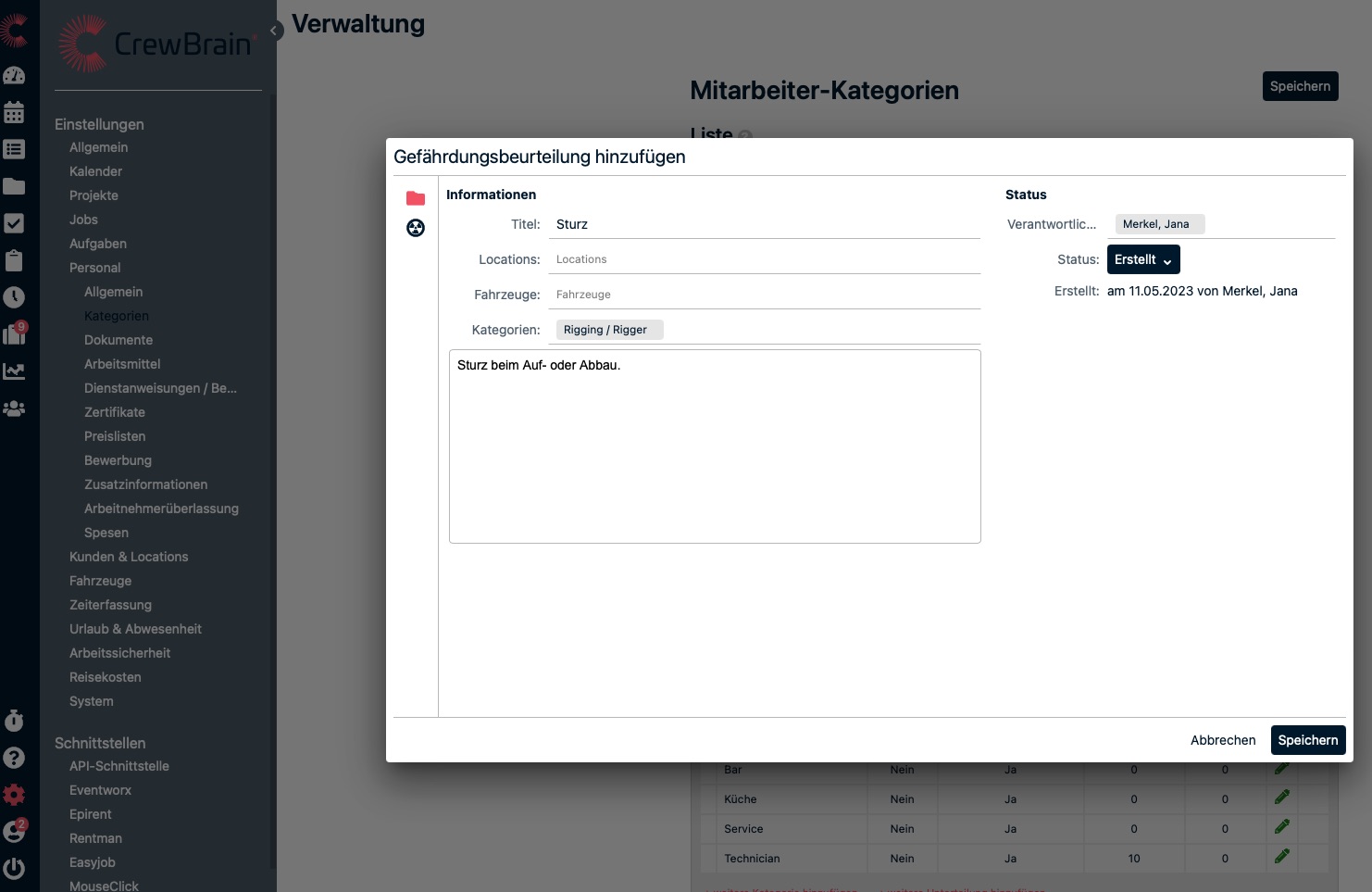 Um einer Mitarbeiter-Kategorie eine Gefährdungsbeurteilung zuzuweisen, muss das Bearbeitungsfeld der Mitarbeiter-Kategorie unter Verwaltung > Personal > Kategorien mit einem Klick auf das Stiftsymbol hinter der gewünschten Kategorie geöffnet werden. In der sich öffnenden Maske ist auf der linken Seite das Symbol für die Gefährdungsbeurteilung zu finden. Hier kann nun eine Gefährdungsbeurteilung durch einen Klick auf das graue + oder auf "+ Gefährdungsbeurteilung hinzufügen" oben rechts hinzugefügt werden. es öffnet sich nun eine neue Eingabemaske "Gefährdungsbeurteilung hinzufügen". Hier sollte nun der Titel sowie eine kurze Beschreibung hinterlegt werden. Die Kategorie ist bereits vorausgewählt, kann aber durch einen Klick in das Feld um weitere Kategorien ergänzt werden. Außerdem wird die bearbeitende Person standardmäßig als Verantwortliche(r) eingetragen. Auch dies kann geändert werden. Des Weiteren wird der Status der Gefährdungsbeurteilung angezeigt. Dieser lautet zunächst "Erstellt".
