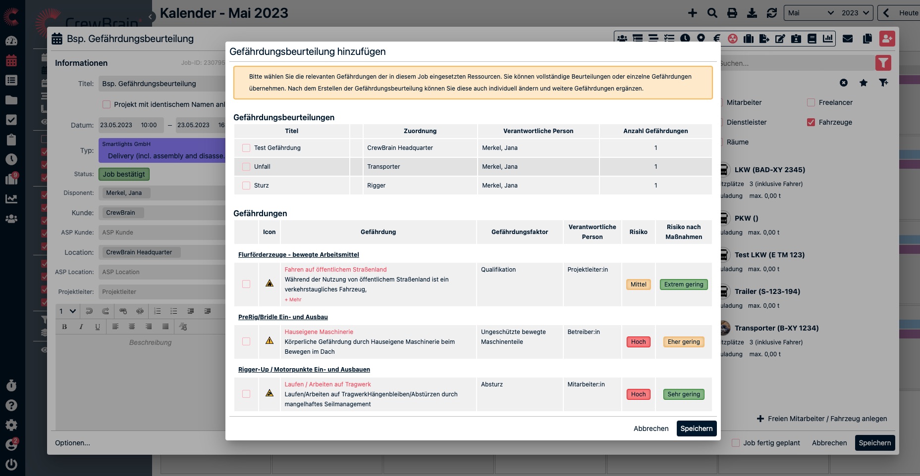 Die erstellten Gefährdungsbeurteilungen können nun zu Locations, Fahrzeugen und Mitarbeiter-Kategorien hinzugefügt werden.