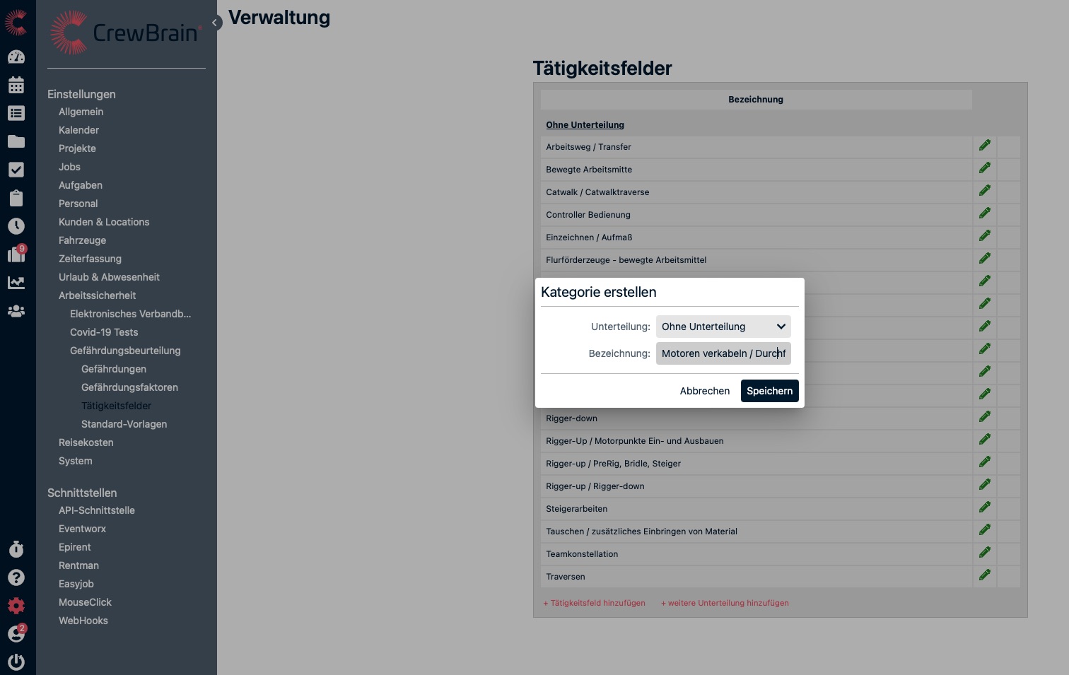 Analog zu den Gefährdungsfaktoren können unter dem Menüpunkt "Tätigkeitsfelder" ebendiese angelegt werden. Mit einem Klick auf "+Tätigkeitsfeld hinzufügen" kann die Bezeichnung des Tätigkeitsfeld eingetragen sowie optional die Unterteilung gewählt werden. Auch hier hilft die Unterteilung die Tätigkeitsfelder übersichtlich darzustellen. Eine Gefährdung kann auch mehreren Tätigkeitsfeldern zugeordnet werden. Auf diese Weise können Duplikate reduziert werden, was zu mehr Übersichtlichkeit bei der Erstellung der Beurteilungen führt.