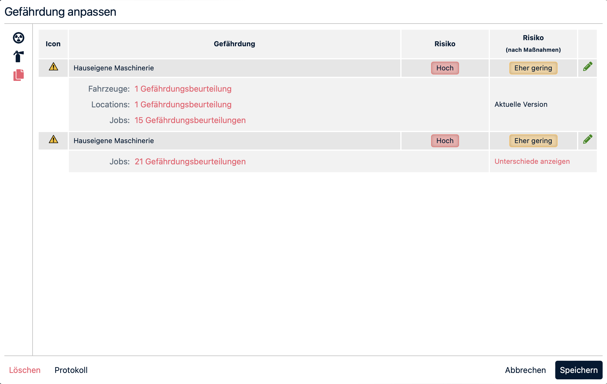 Wird eine Gefährdung im Laufe der Zeit z.B. auf Grund neuer Erkenntnisse angepasst, so bleiben die historischen Daten weiterhin im System erhalten. Auf diese Weise bleiben Gefährdungsbeurteilungen aus der Vergangenheit unverändert, während künftige Beurteilungen von den neuen Erkenntnissen profitieren. Jede Gefährdung besitzt einen Tab mit der Übersicht aller Versionen. Dort sind auch einfache Vergleiche der Änderungen möglich.