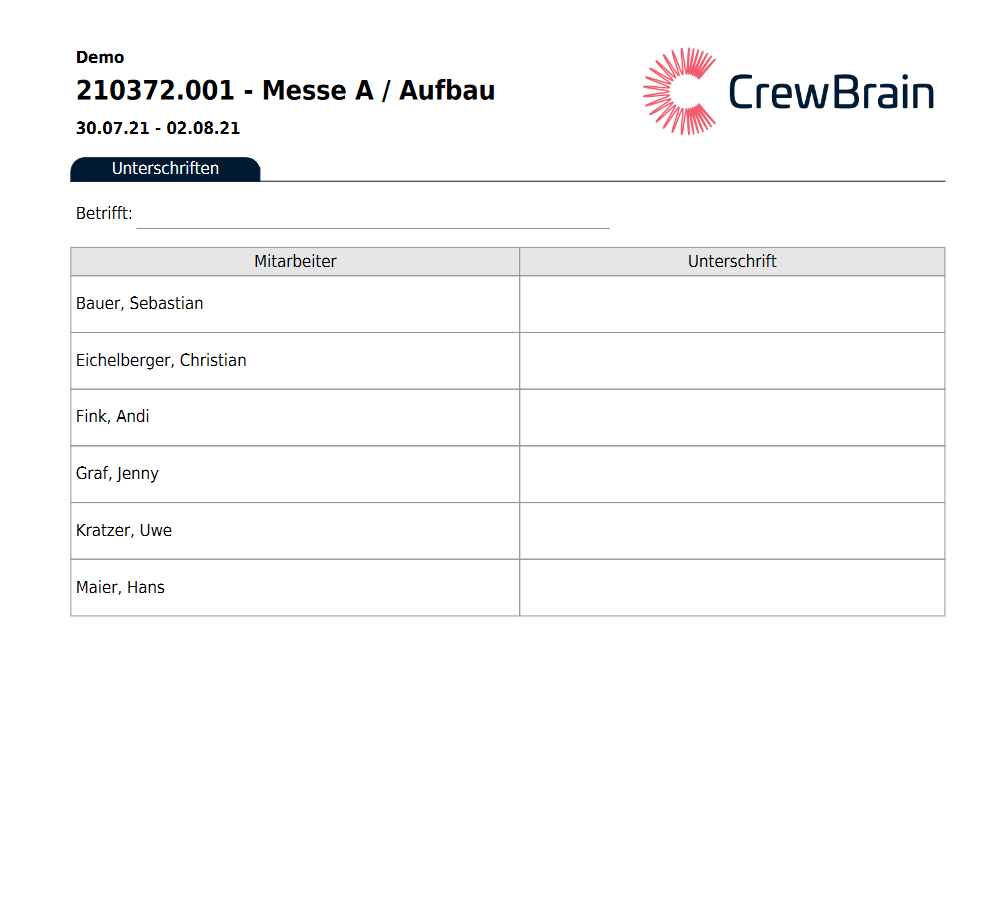 Oftmals benötigt man Unterschriftenlisten für bestimmte Jobs. Diese können Sie sich ganz einfach über CrewBrain ausgeben lassen. Enthalten sind alle Mitarbeitern, die für den jeweiligen Job fest gebucht sind: