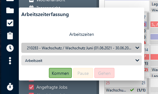 Durch Klicken auf die Stempeluhr in der Menüleiste öffnet sich eine Maske. Voreingestellt wird auf den Job gestempelt, für den Sie gerade gebucht sind. Beim oberen Reiter können Sie aber auch auswählen, ob sie unabhängige Arbeitszeiten (keinem Job oder Projekt zugewiesen), oder Zeiten auf einen anderen Job oder Projekt erfassen wollen. Unter Verwaltung > Projekte > Voreinstellungen können Sie wählen, welche Projekte-Typen für wen in der Stempeluhr sichtbar sein sollen. Beim unteren Reiter wählen Sie aus, ob es sich um Arbeitszeit, Fahrtzeit oder Schule/ Schulung handelt. Diese Zeitkategorien können unter Verwaltung > Zeiterfassung > Zeitkategorien konfiguriert werden. Klicken Sie nun auf "Kommen", damit die Stempeluhr zu zählen beginnt , auf "Pause" für Pausen und auf "gehen", wenn Sie sich wieder ausstempeln wollen. Die so erfassten Zeiten werden automatisch in der Abrechnung bzw. der Zeiterfassung und in dem entsprechenden Job bzw. Projekt hinterlegt.