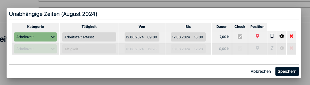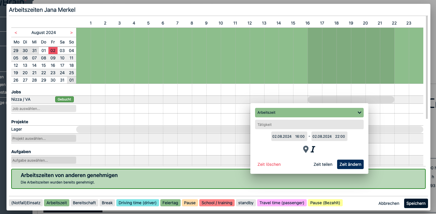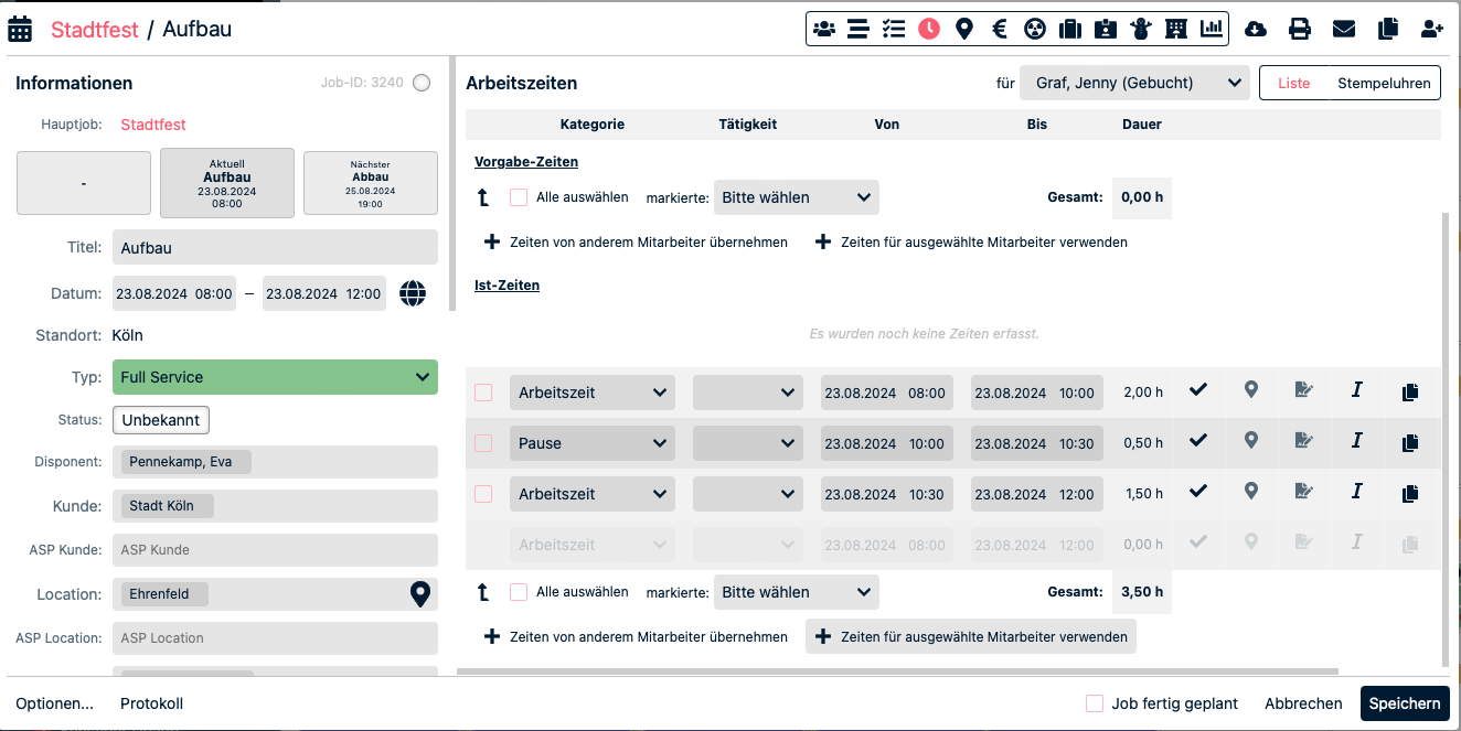 Hierbei handelt es sich um die manuelle Eintragung von Arbeitszeiten. Der Projektleiter kann Zeiten für einzelne Personen, die in den Job gebucht sind eintragen oder Zeiten für alle eintragen. Auch das Bearbeiten (Stiftsymbol) und Löschen (Mülltonnensymbol) von Zeiten ist in dieser Ansicht möglich.